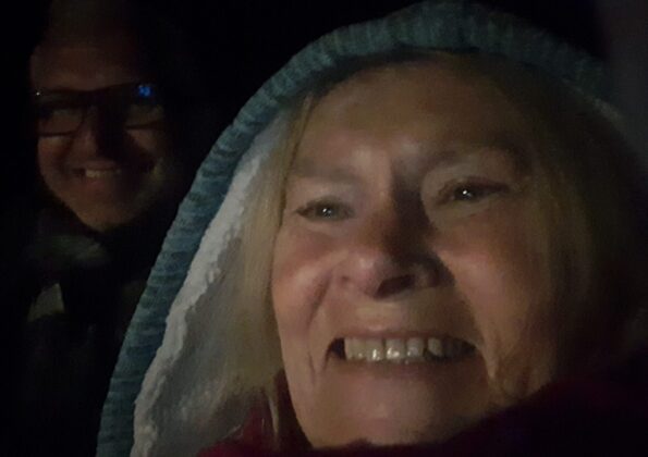 It was interesting to see Chris juggling with the inflatable frame, a white cloth as screen and two speakers, then hey presto the cinema was ready. However, it was still too light and we had to wait until the sun went down. To start with, he showed three short screenings which were recordings of the different marsh choirs, absolutely wonderful in this eerie surrounding. By the end it was dark enough and the actual film, Great Expectations started, David Lean’s black and white version, which was very intense. Then midway through the film the lights on the two nuclear power stations came on in the distance. It was a delightful evening.