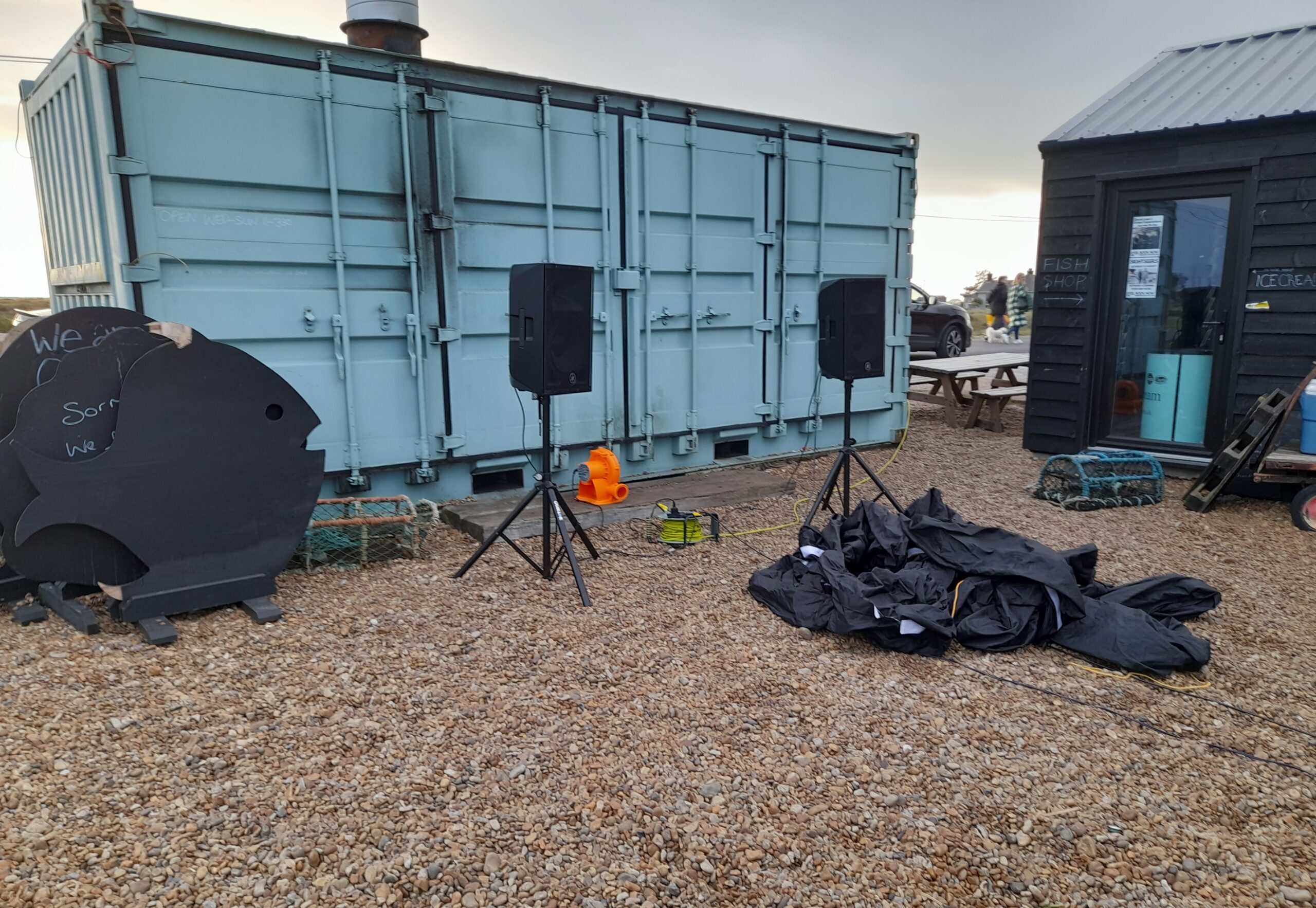 For anyone not aware of the occasional summer open air cinema behind the fish shack in Dungeness, they are truly missing something. The singers of the Marsh Choir were told by their leader Carly Bryant about the screening of Great Expectations, as advertised on Instagram. By arriving early one could bag a space, there were benches and tables dotted around at the back of the shack, used by customers when the Snack Shack is open and selling fresh fish.