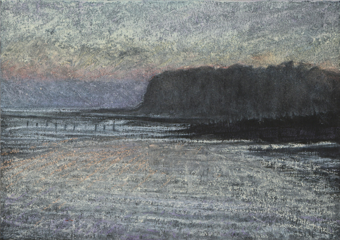 The curators wanted to specifically highlight abstract landscapes alongside works of a more traditional winter theme, including mixed media, prints and illustrations. It was felt that the painting of the month should be Albert Goodwin’s (1845-1932) Rye, A Winter’s Tale, 1920 watercolour from the permanent collection. It was donated as part of a bequest by Eileen M Easton (who died 1965) who was a good friend of Mary E Stormont (who died 1962), both creating the gallery.