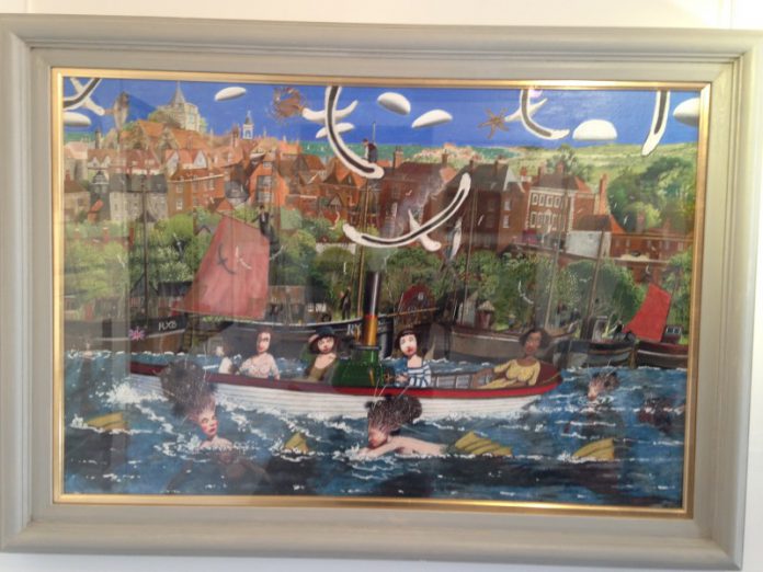 Many other well-known artists are featured in the show. Richard Adams’ chalk pastel Marine-Ville (shown above) is well worth seeing and priced at £5,650. Matt Hardman, who has a set of devoted fans, has a number of items on display, including his mixed media Tooth Hairy (right) priced at £425.
