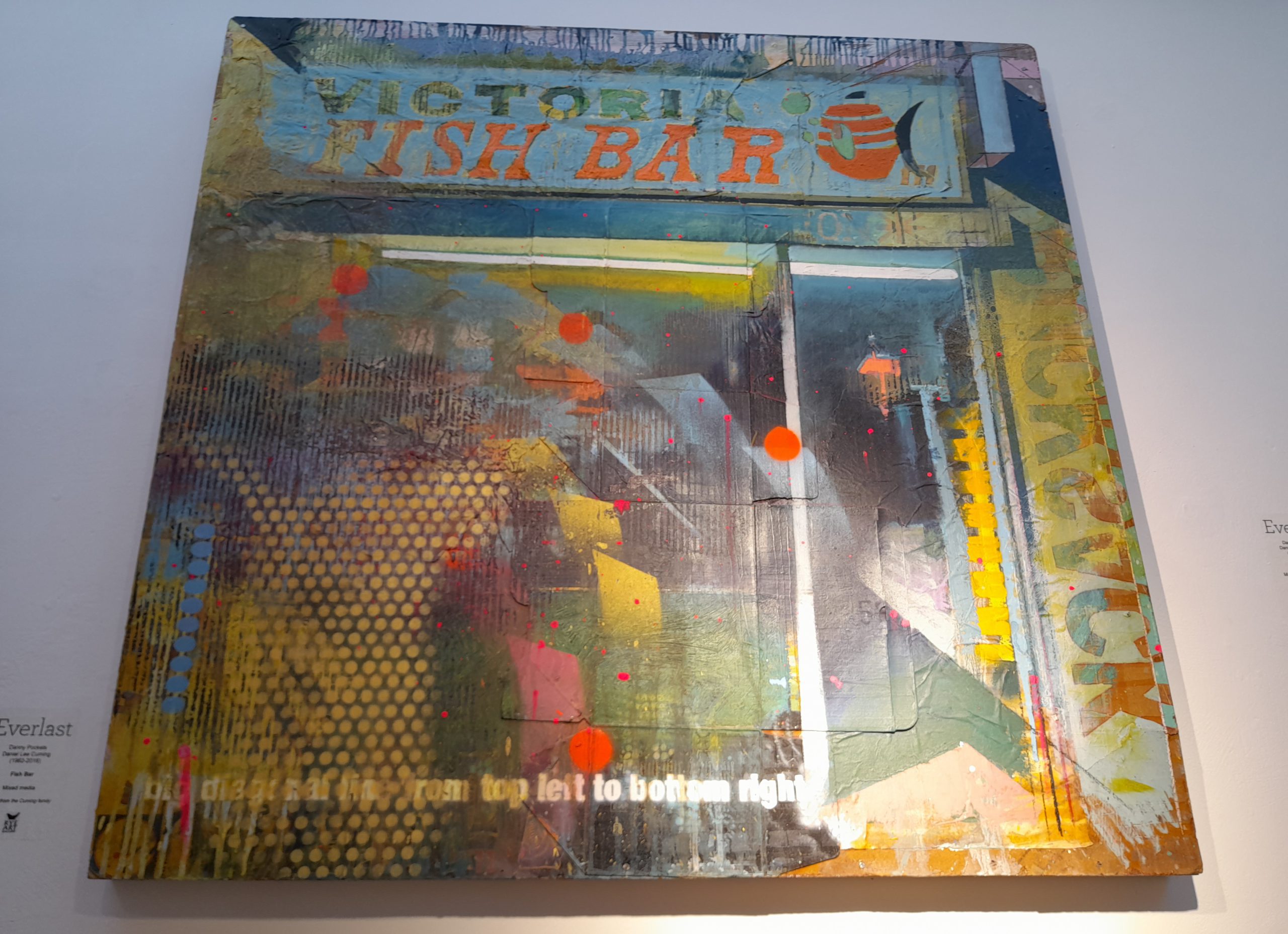 Louise Simkiss-Day expresses it well in her introduction of the catalogue: “A retrospective in the art world is usually a comprehensive survey of an artist’s work, usually including, ‘dare I say’, their greatest hits and one wonders perhaps if and how Danny might have developed in the years he sadly did not have”. Danny was interested in the rock & roll music and art sonic scene, being a performer, player and ahead of his time in terms of how to look at art.