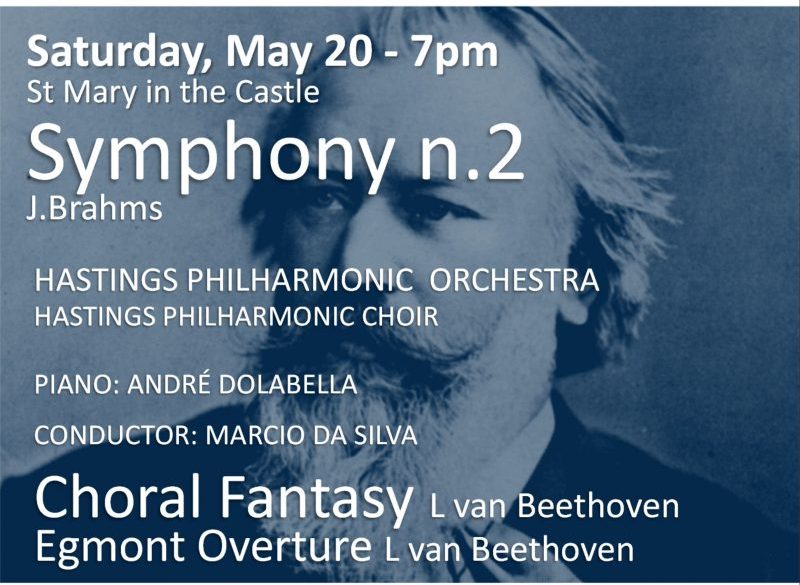 The Hastings Philharmonic Choir and Orchestra, the newest fully professional orchestra in the South East, according to their website, having opened the season in September 2016 with Beethoven’s Choral Symphony at the White Rock , will announce the very exciting 2017/2018 season to come at the Brahms and Beethoven concert on May 20 at 7.00pm at St Mary’s in the Castle, 7, Pelham Crescent, Hastings. They are returning to perform  J. Brahms  Symphony no.2, the major work in the programme. It is a substantial romantic work which will draw on all the resources of the orchestra and should be a treat. The rest of the concert features Beethoven’s Choral Fantasy 0p. 80 and J. Brahms’  Egmont Overture .