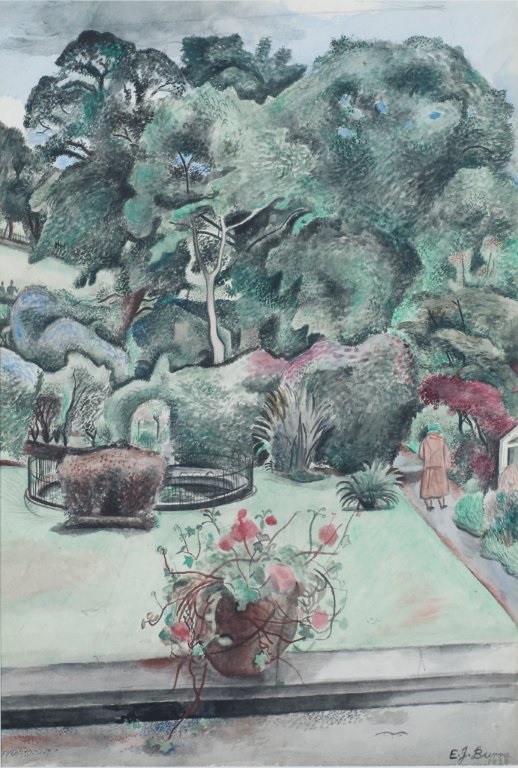 Edward Burra was born in London but lived most of his life in Playden near Rye – referring to it as Wry or more fulsomely: “Ducky little Tinkerbell towne is like an itsy bitsy morgue, quate dead.” Chronic arthritis and a blood disorder kept him from a formal education. Consequently, he was educated at home which possibly fed his love of the countryside. Later, he went to Chelsea and then on to the Royal College of Art where he met fellow artists who proved to be lifelong friends.