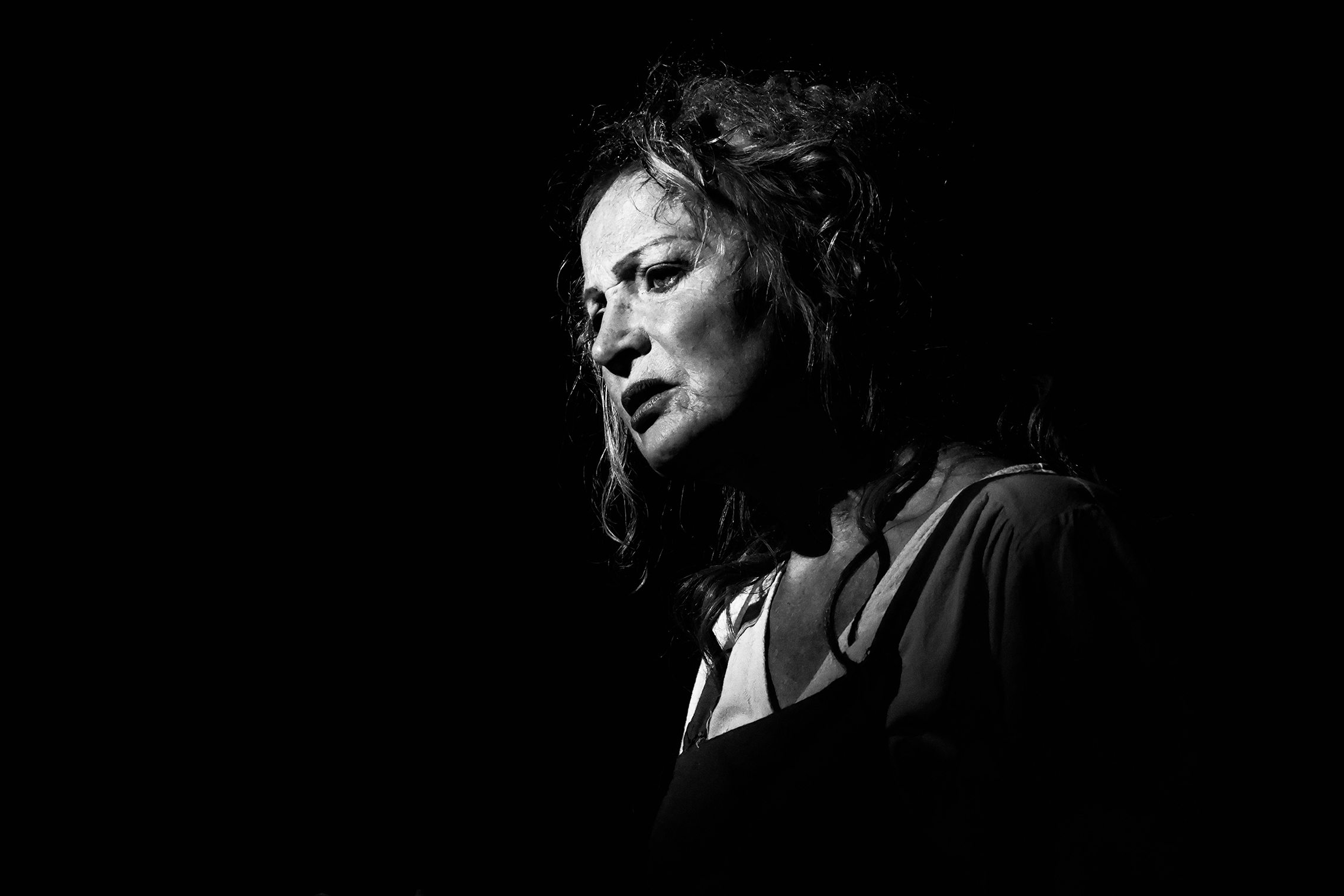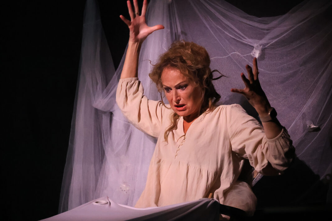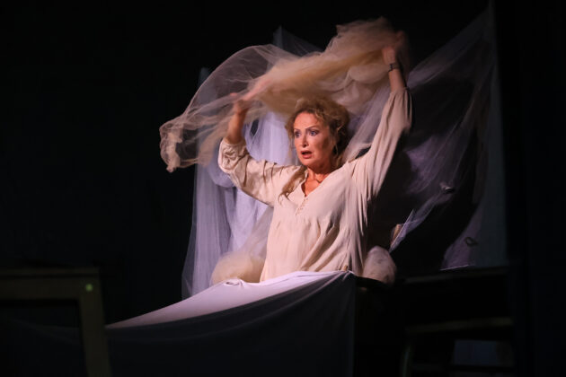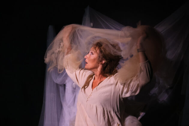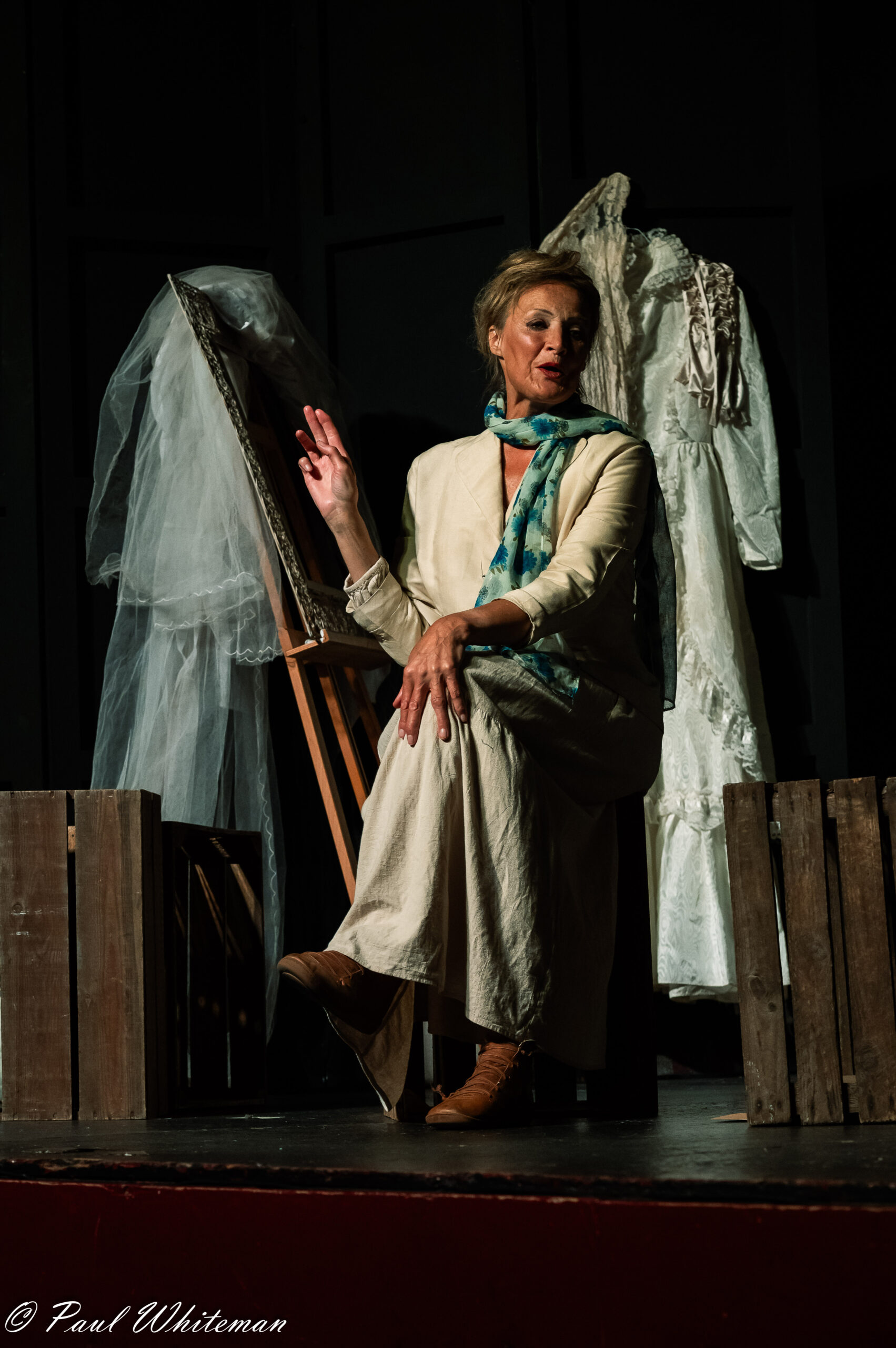 “The staging was simple, the set comprising a chair, some wooden crates, a mirror. Various flimsy white garments and of course, the iconic wedding dress, were decorous and symbolic components of the clever scenery. Sound and light were expertly deployed and the recorded voices were particularly effective.