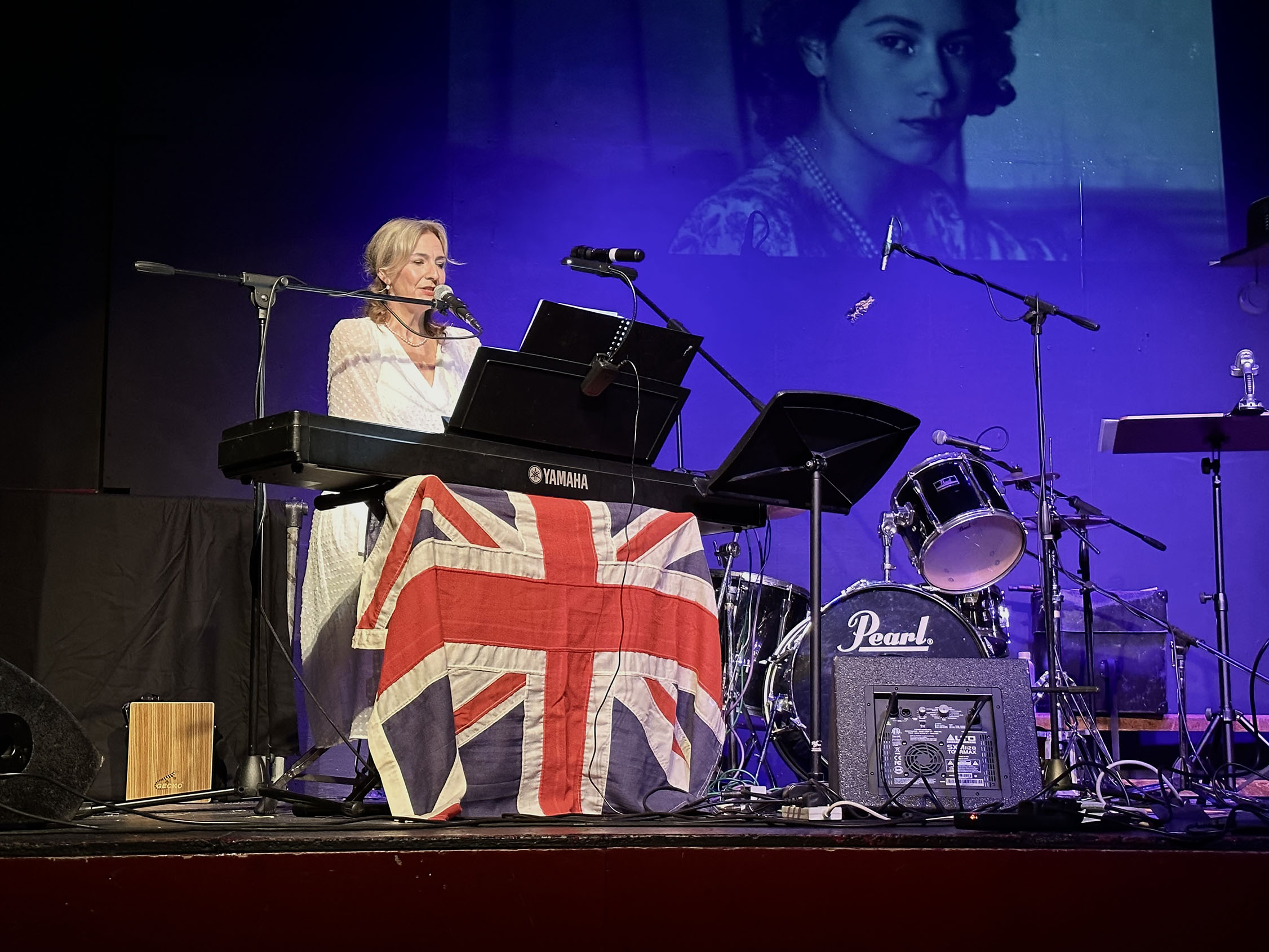 From the moment Kate walked on stage she established an easy rapport with her audience. She performed beneath a black and white photograph of the young Elizabeth and treated us to charming classics – Bye, Bye, Blackbird and They’re changing the guard at Buckingham Palace, for instance, as well as unfamiliar gems like the song written for the young princess (aged four) and Kate’s version of the theme to the Paddington films completed by her own witty lyrics. She also shared with us a song she had composed for the Queen’s platinum jubilee which recalled the days of music hall and which had prompted a letter of approval from the monarch herself.