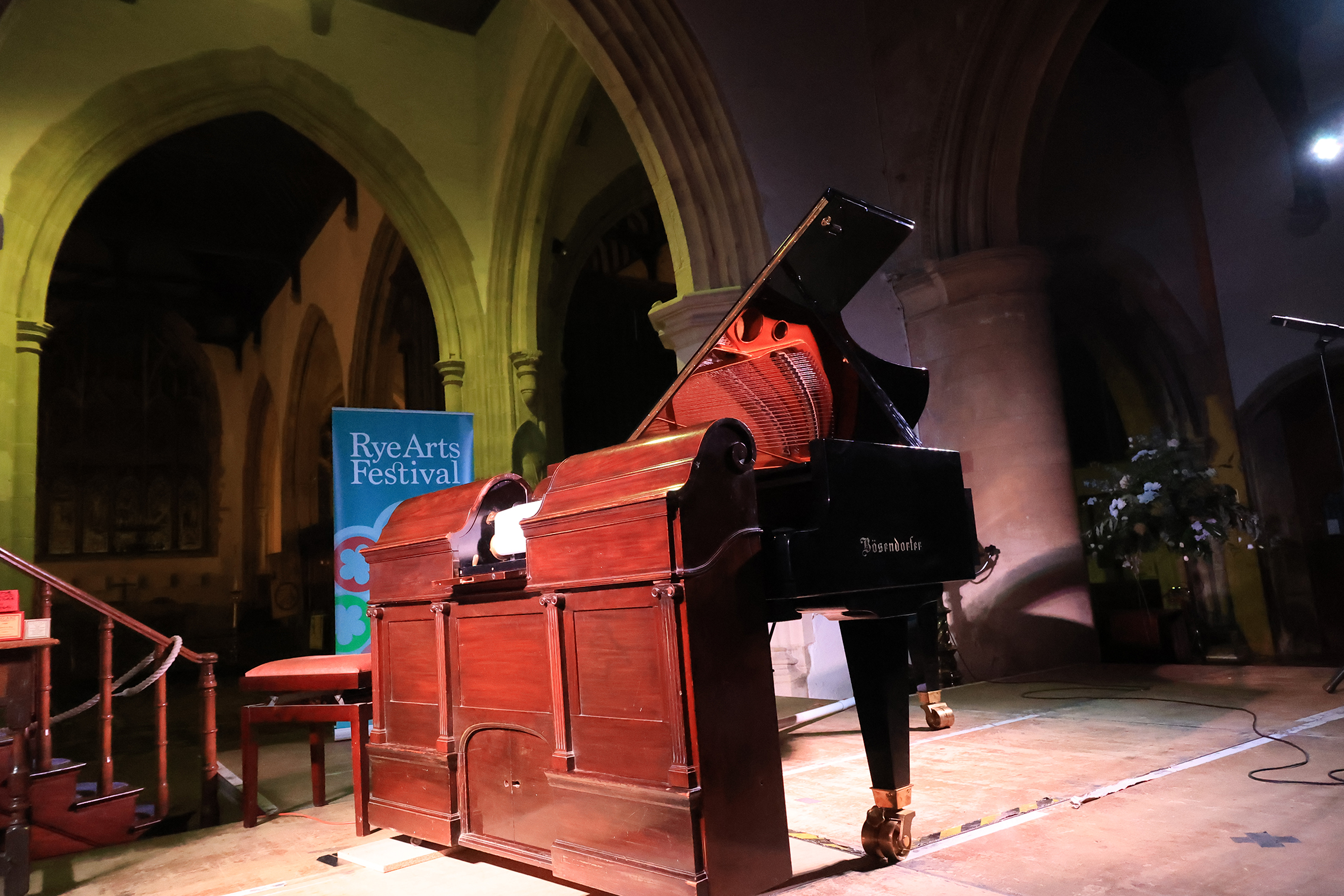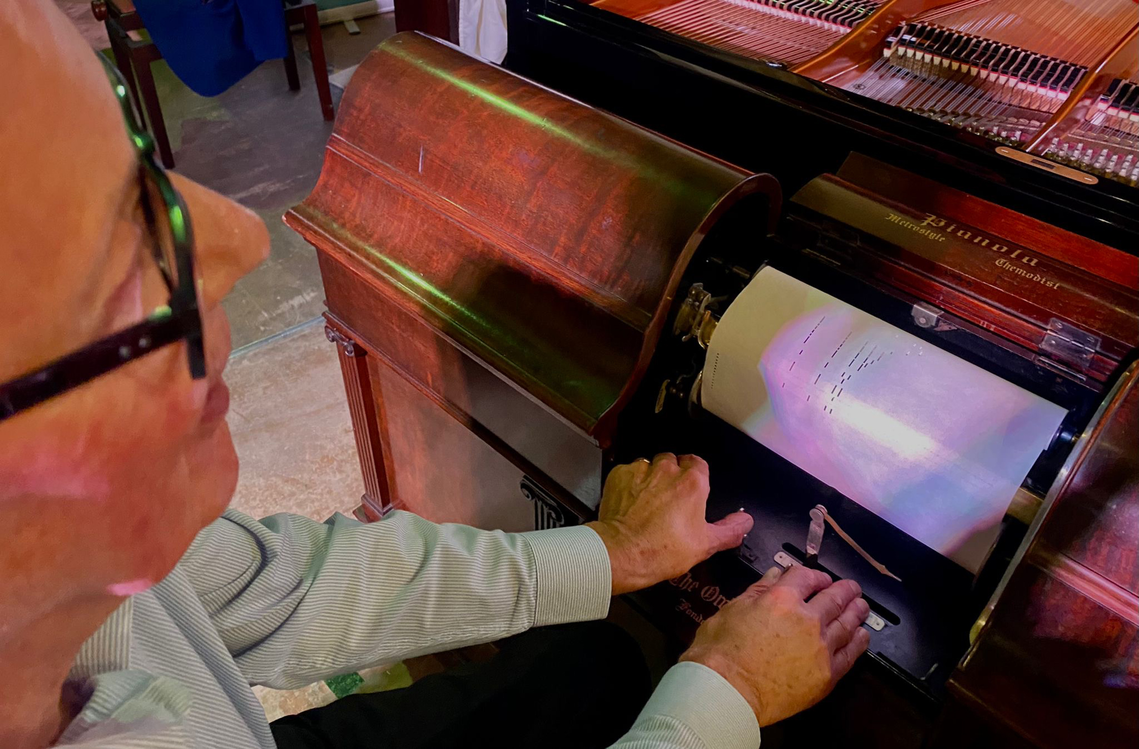 For Rye Arts Festival on Monday September 23, Mike brought two of his incredible machines into the church to play a selection of music that also included Scott Joplin and Fats Waller. A pianola is a self playing piano – it plays the piano’s keys and pumps its pedals, working to a roll of paper marked with notches telling it which notes to play and when. Each roll of paper recreates the sound of the original performance.