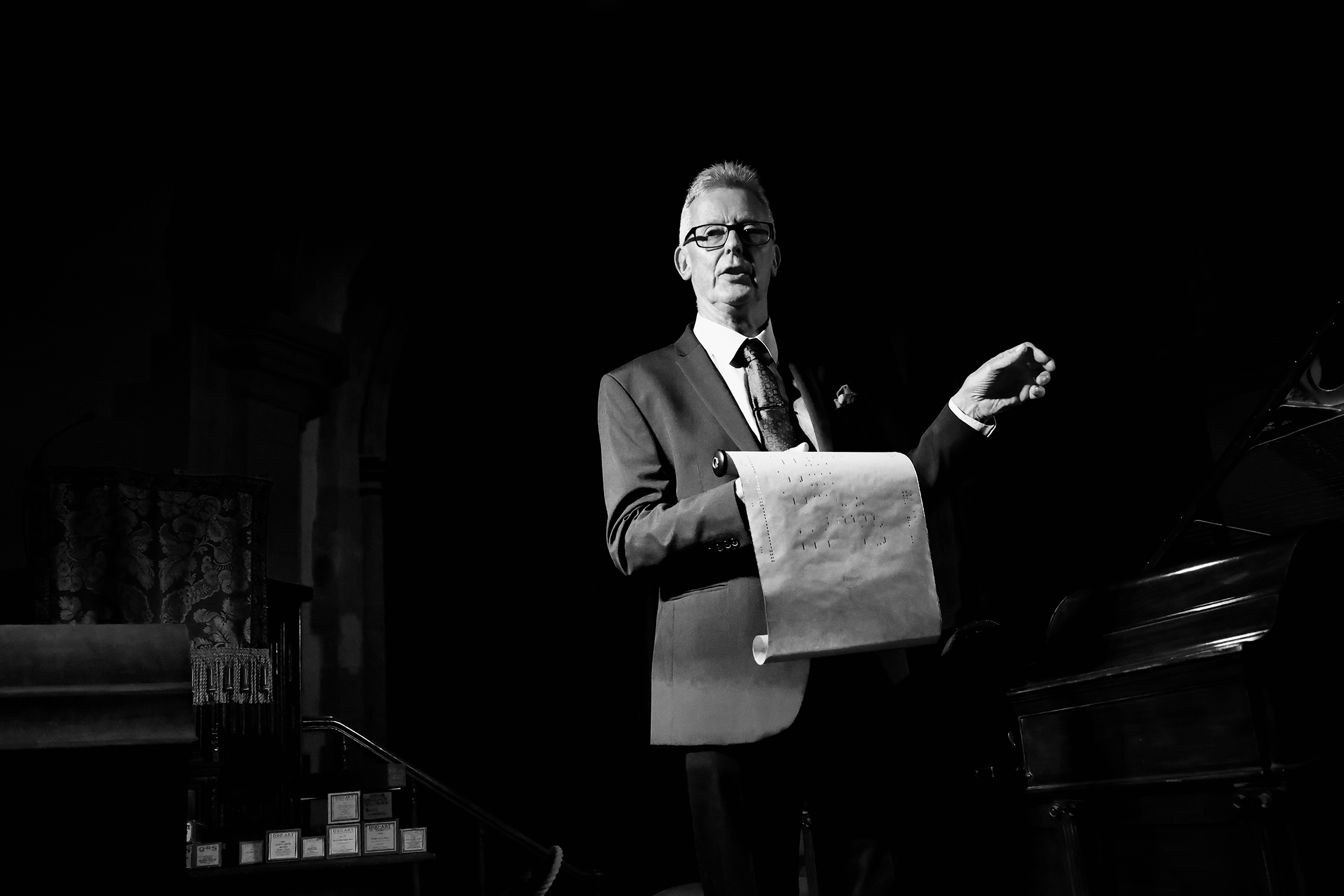 Each piece of music requires a different roll of paper allowing Mike to explain more about the music as he lovingly laces up each tune. For the first half of the performance the electric pianola is used, making a pleasing hum as its pneumatic motor springs into life. For the second half, it’s Mike at the pedals of a second machine which needs foot power.