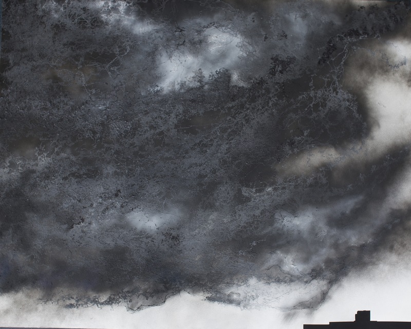 This exhibition is a powerful force of nature itself and the description of these dramatic brooding skies show the full force of nature with the touch of the building in the bottom right hand corner giving scale to the work – with mixed media and large scale works creating powerful images.