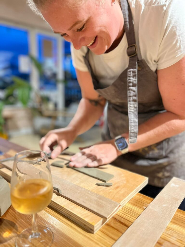 followed Lauren’s lead, while others ventured off in their own creative directions. With a slab of clay, a quick demonstration, and plenty of encouragement, we were soon rolling, shaping, and laughing our way through the evening. There was clinking of glasses, cups of tea, moments of triumph and the occasional disaster – but above all, a lot of fun.