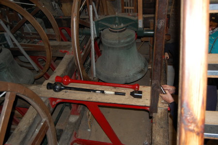 The old clapper lay beside it, snapped cleanly at the top of the shaft with “basically metal fatigue”, said John, “They used to be made of wrought iron and lasted for years, but no one does that work any more on an anvil and a charcoal-fired forge. This one was made of cast steel and went after about only ten years.