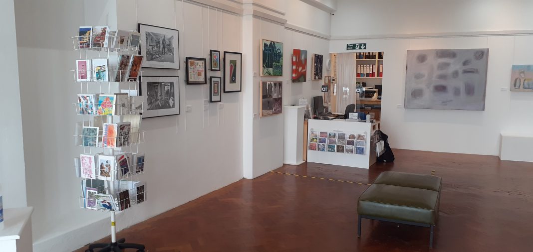 The show is the work of different artists, who are involved in hanging all the shows and, to make it safe for staff and visitors there are sanitisers / hand towels on entry, and on the desk as well a plastic shield where people pay by card only. A sign explains that only three people can be in the gallery at one time and must follow the government guidelines to keep their distance.