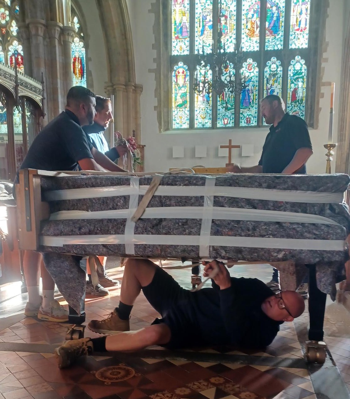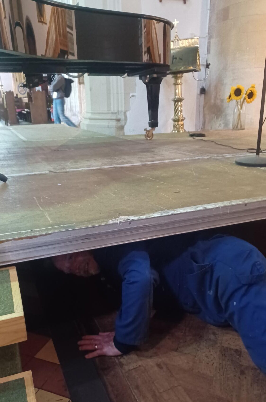 A couple of days later and the piano needed to be moved across the stage to create a space for a violinist, but the blocks under the stage to support the three piano legs also needed moving. So church warden Roy Abel, dressed in blue overalls, volunteered to crawl, like a coal miner of yesteryear, underneath the stage to do the job.