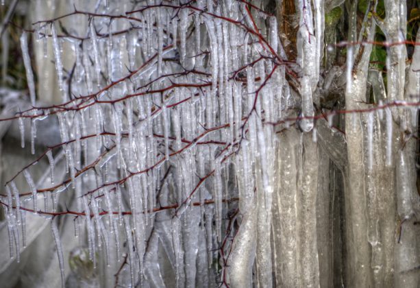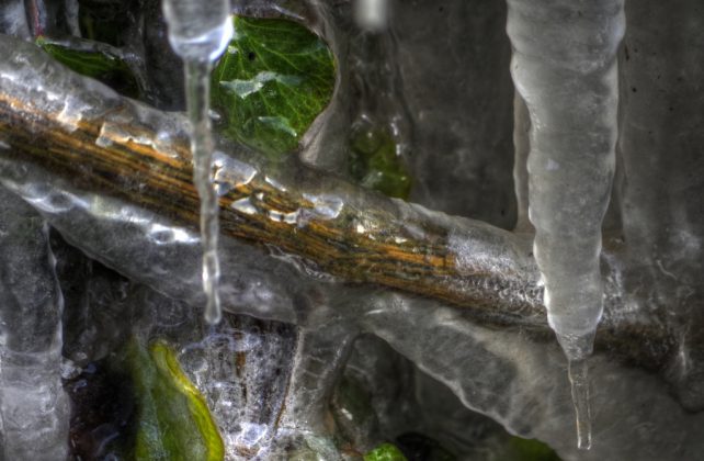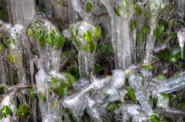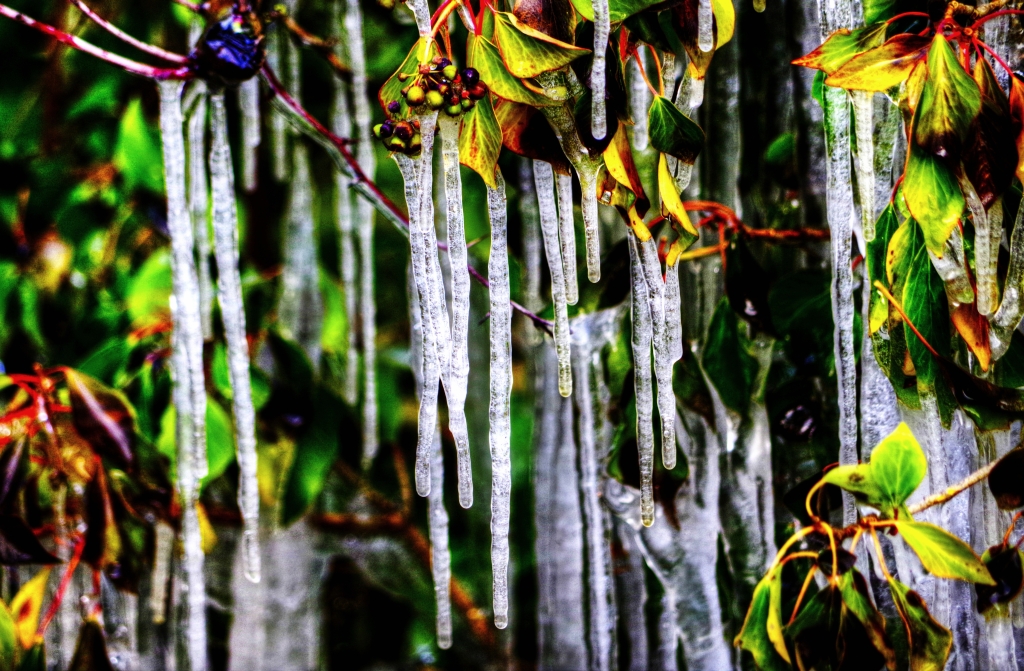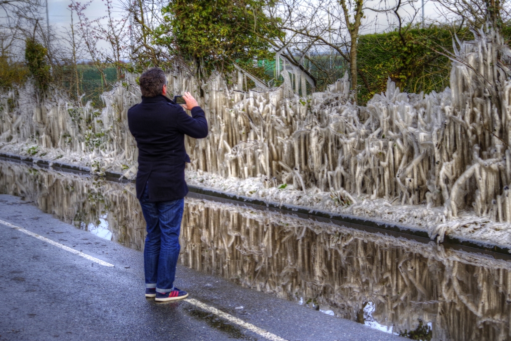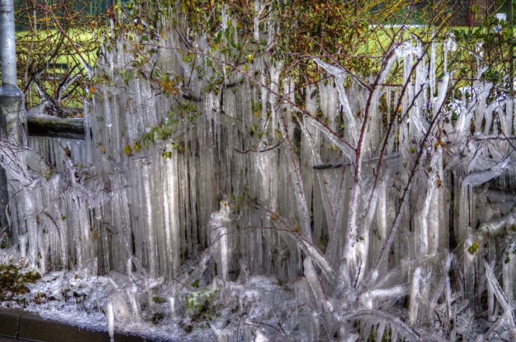 This week started with a drizzling rain that made the snow and ice seem like a distant memory but these photos, taken by Peter Loeffler whilst walking in Military Road, proves it was for real. As reported last week, vehicles encountering a giant puddle outside the entrance to the tennis club caused repeated spray to envelop the roadside hedge and turn it to ice, producing these wonderful shapes and colours.