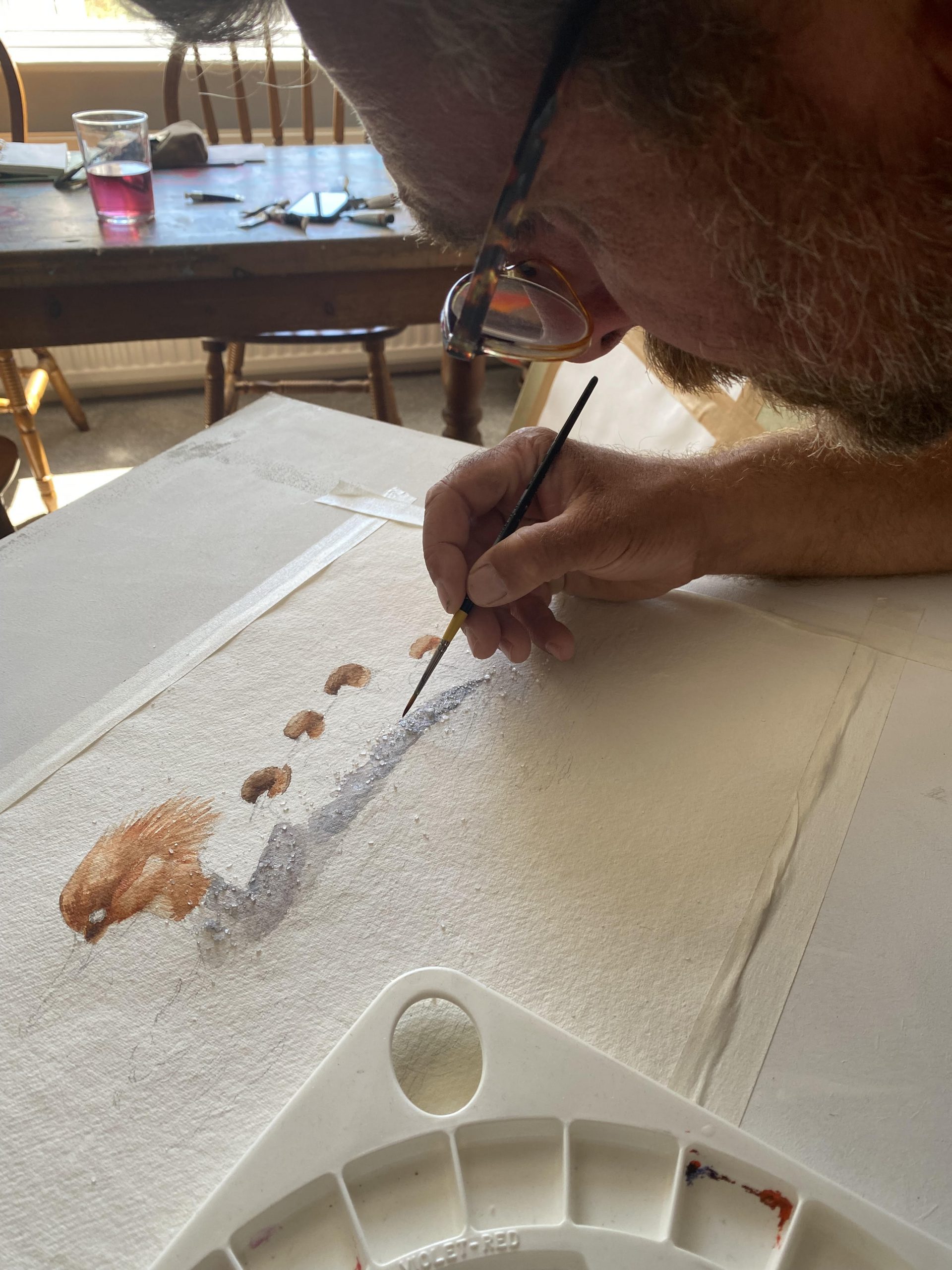 I like watercolour as it is spontaneous. I choose to work in the field but catching birds’ movements and gestures is not easy as they don’t stay still for long. I have tried to work from photographs, but it isn’t right for me. I sit in a hide and lose myself in sketching.