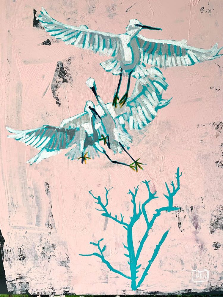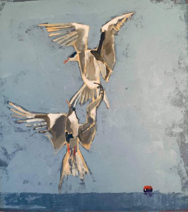 The idea of “Locals” came from my love of birds and of Rye Harbour nature. I began to sketch them when birdwatching during lockdown and was inspired to paint their beauty and individuality. The exhibition at Rye Bank Gallery reflects where I am in my life at present. I’m at the nature reserve every day; I do a circuit and count the bird numbers and see the ever-changing landscape of the reserve. The challenge has been duplicating this into my paintings, which I have thoroughly enjoyed. I have recently been inspired by the Scottish colourists with their finer brush strokes and colour and this new work is a conscious move away from my previous exhibition where I used elements of graffiti.