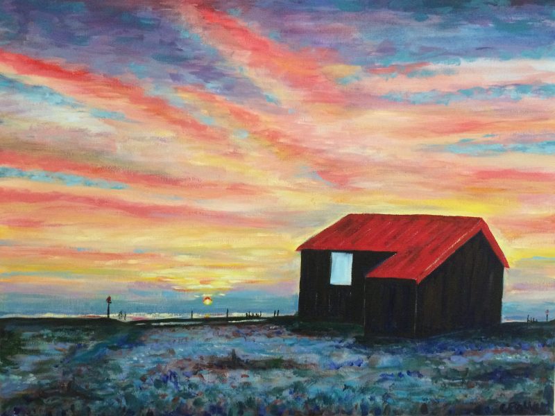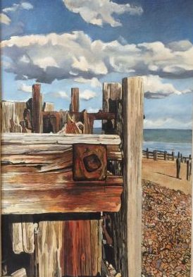 Among the landscapes, many artists have painted the red hut (above, left) on the nature reserve, this time in acrylic, but Linda Graham’s lino print of Strand Gate at Winchelsea (below left) provides a different sea vista, and medium, while  Colin Bailey’s oil “Outpost” (below right) is yet another sea view.