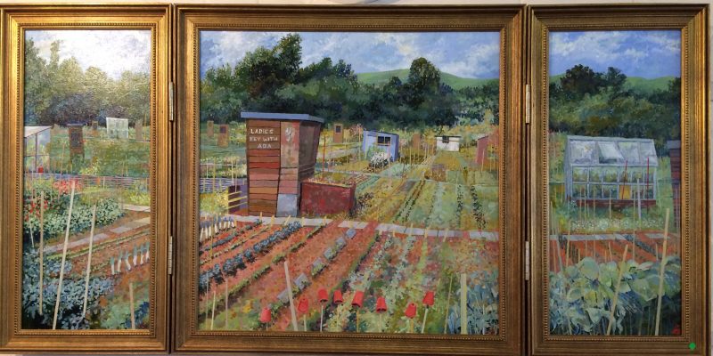 For the 50p entrance fee, works of a high quality can be seen, and the triptych “In Memory of Ada” (main picture) by Dr Richard Manwaring Baines, DPhil, President of the Club and past president of the Royal Institute of Oil Painters, greets you on entry. The amusing story behind the painting is there for you to read and enjoy as well as the triptych itself.