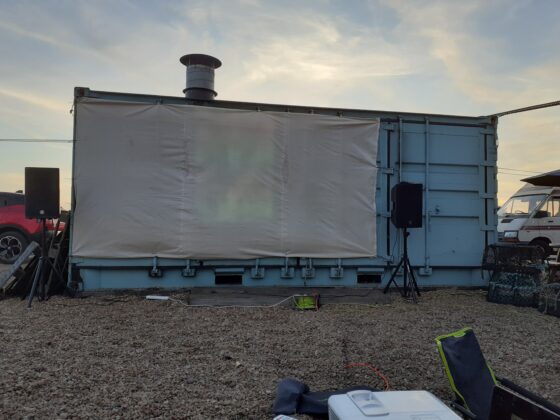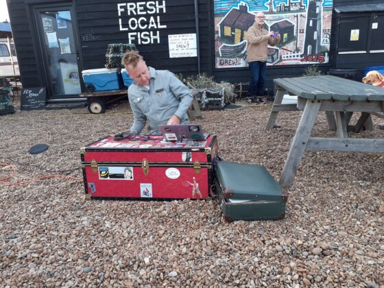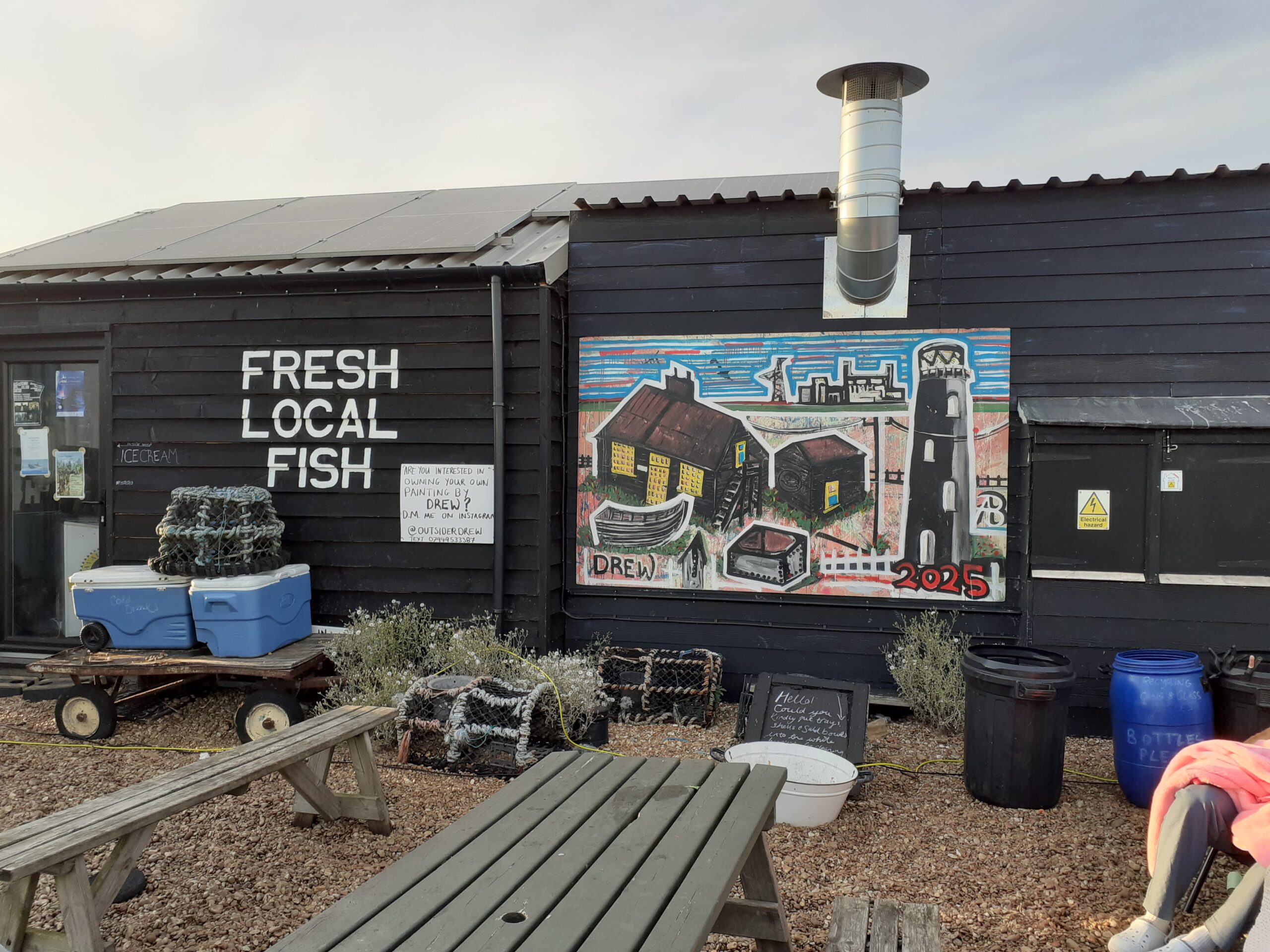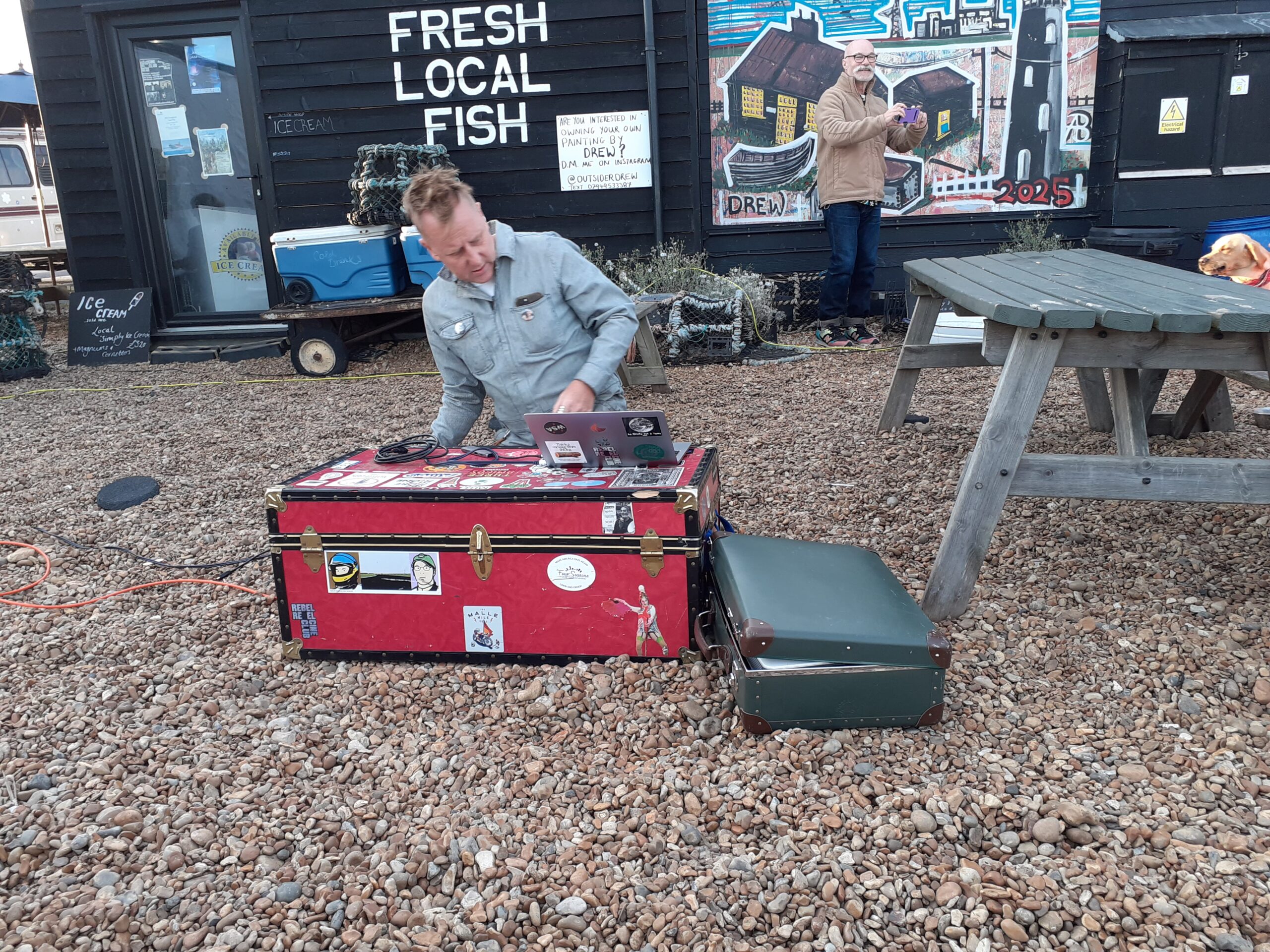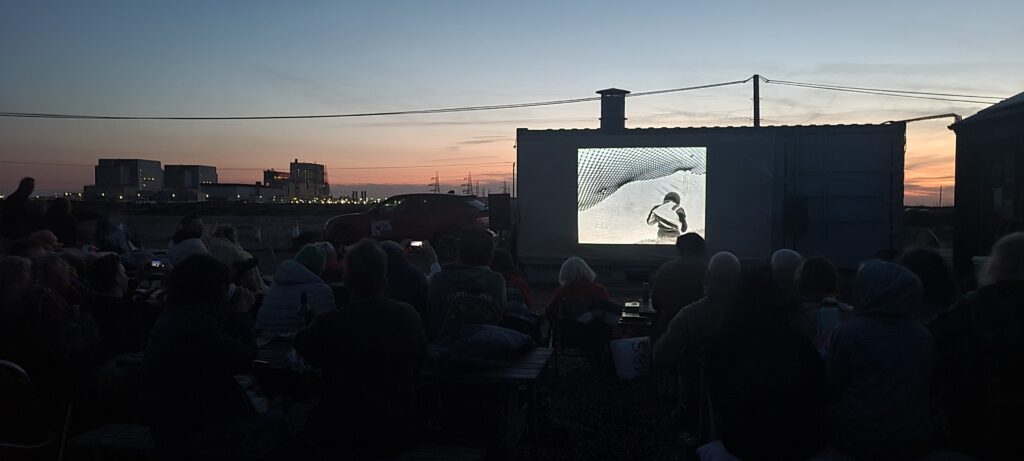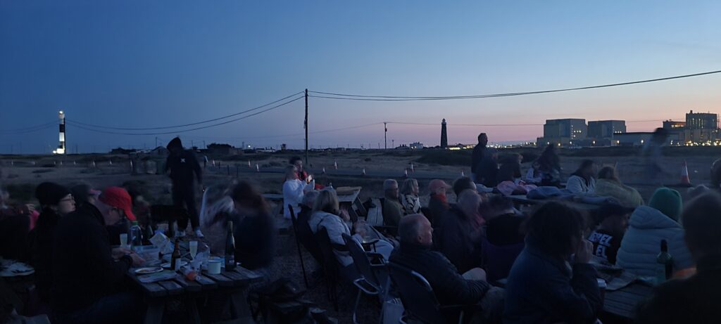 If you enjoy films in the open air, Dungeness isn’t that far to go to have a great experience in this beautiful, eerie, easy-to-get-to area. A Rye fan group of Rebel Reel Cine Club meets there once a year when Chris McGill puts on his films at the Snack Shack in the middle of nowhere. There are a few tables and benches but most of the crowd, from Rye and around, bring chairs. As one has to wait until the sun goes down, it gets chillier as the evening cooler air sets in. But most are seasoned fans and bring jumpers, jackets, and blankets.