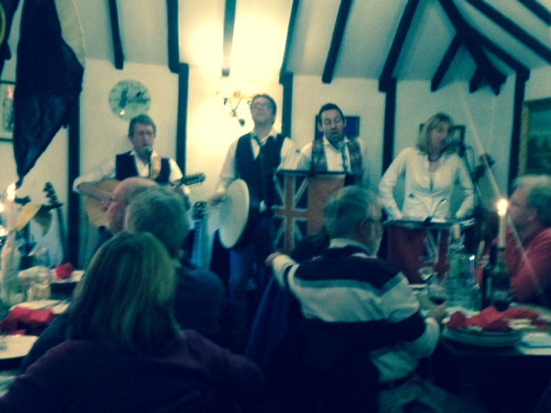 The performance was accompanied by an excellent two course meal of scallops followed by fish pie. The musicians were on a tight schedule because the rock band Black Sheep was due to perform in the main part of the bar at 9pm. But when the Crew had finished the set, the audience refused to let go and two more songs were performed – one, Sloop John B, by popular demand. In the gaps between the notes, the strains of Black Sheep could be heard, losing the battle of the bands.