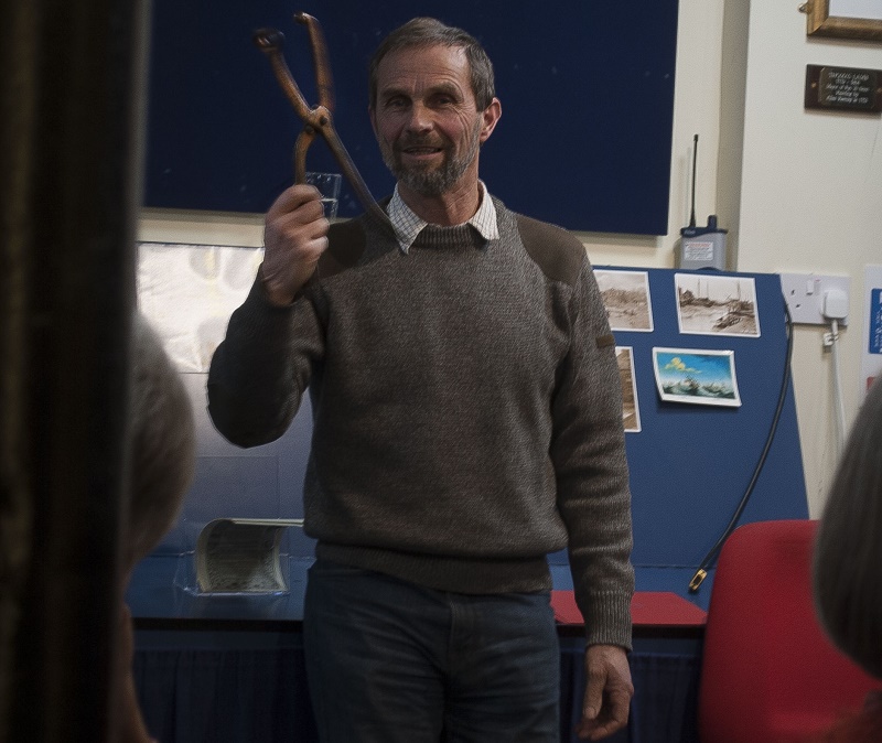 In the photo Melvin holds up one of several mystery tools he brought to show the audience. If you want to know what this one does, you’ll need to attend another of his local talks. [Source : Rye Museum]