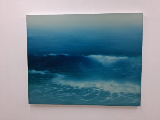 Next was Nick Archer’s very large room hung with his expressive large artwork. His new experiment is painting on copper. The arc in which the small works of different subjects, was arranged, to suggest time passing and change, looking at it clockwise.