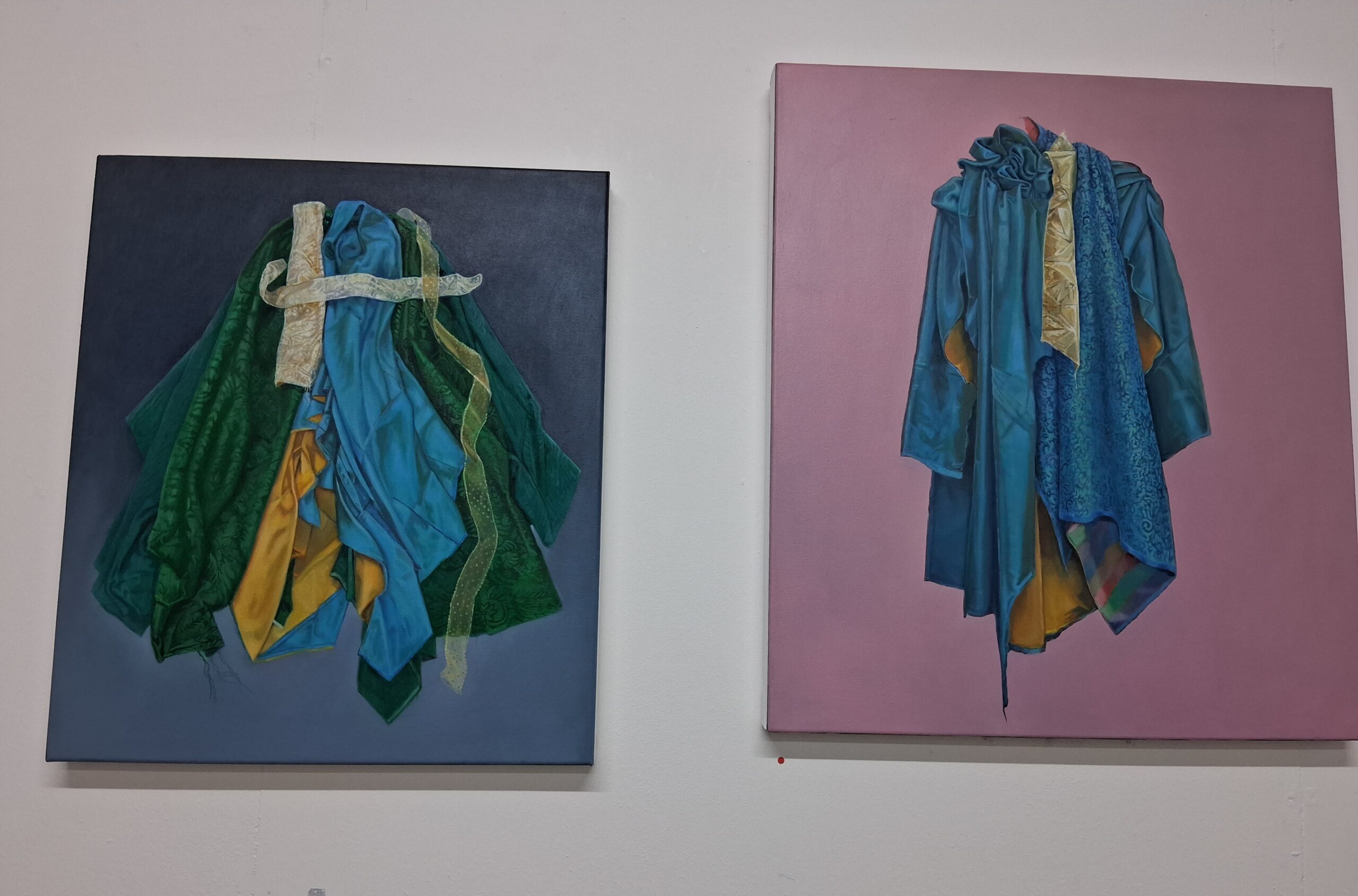 Upstairs were quite a few more studios, one of which was occupied by Jillian Eldridge. A lovely array of colourful fabric greeted the visitors, a lot of sensual Indian material of gold, blue, a special green and more. Jillian’s paintings were of these textiles but arranged in a wonderful way looking like a dress or shawl but as she explained, she just drapes them as she feels like it and then paints the result. She showed in this year’s Summer Exhibition at the Royal Academy.