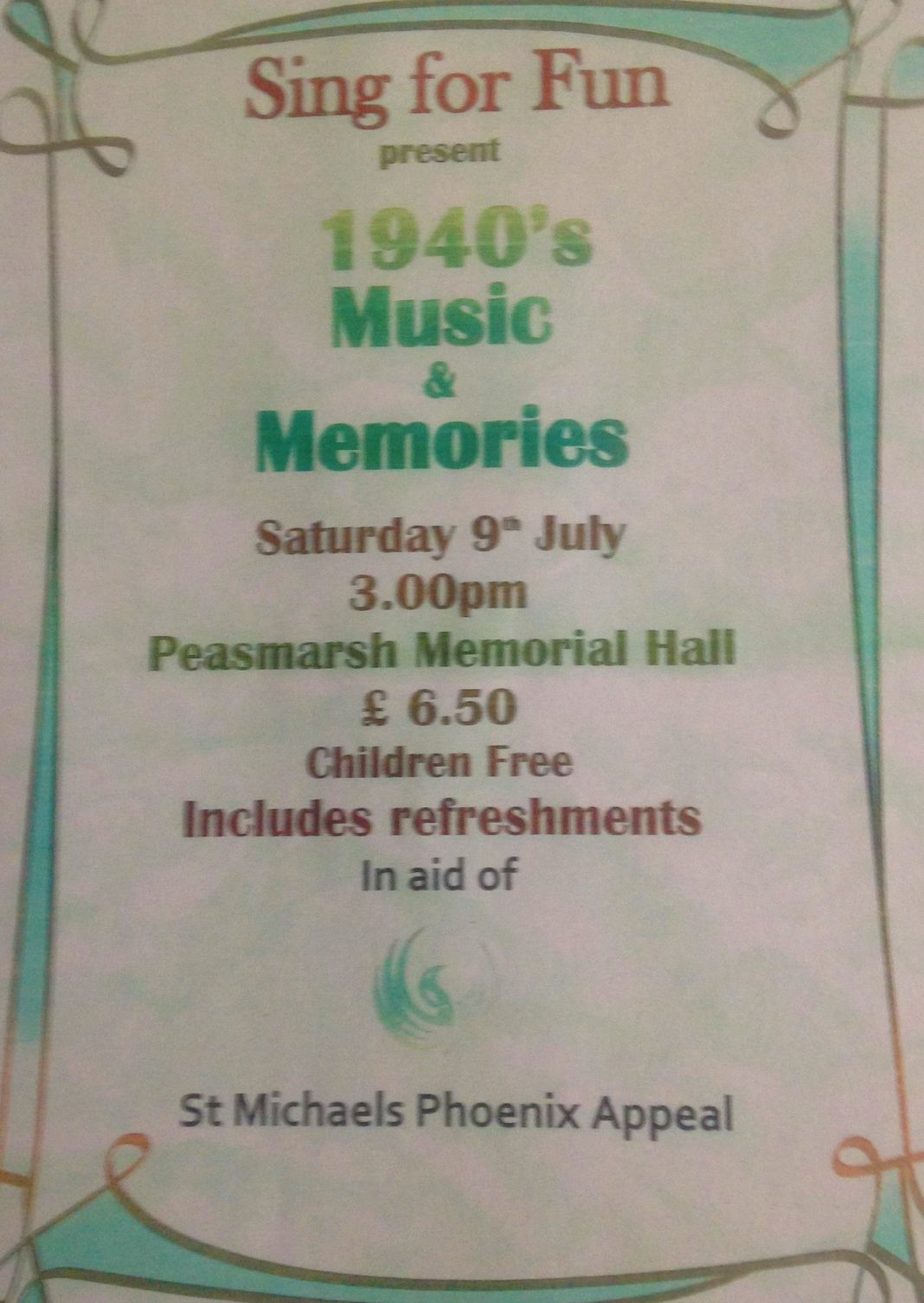 St Michael’s Phoenix Appeal will benefit from the Peasmarsh Sing for Fun group’s presentation of 1940’s Music and Memories on Saturday July 9 at 3.00pm at Peasmarsh Memorial Hall, worth a visit in itself! writes Gillian Roder. Everyone is welcome to join in and a good time should be had by all, do come! £6.40 entrance, children free, refreshments included.