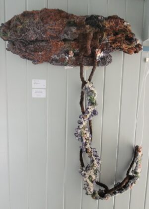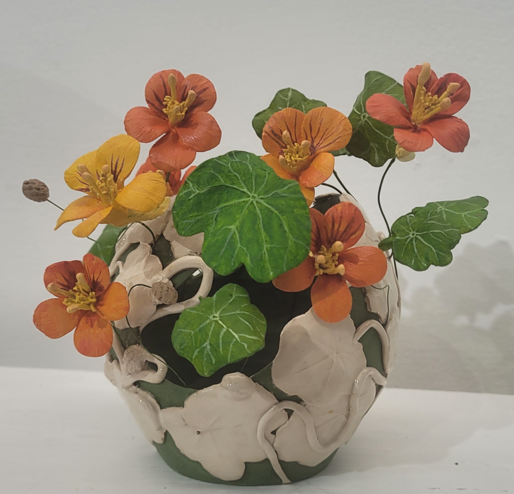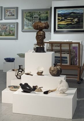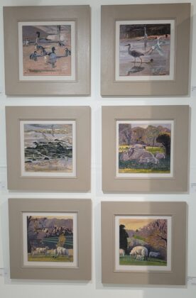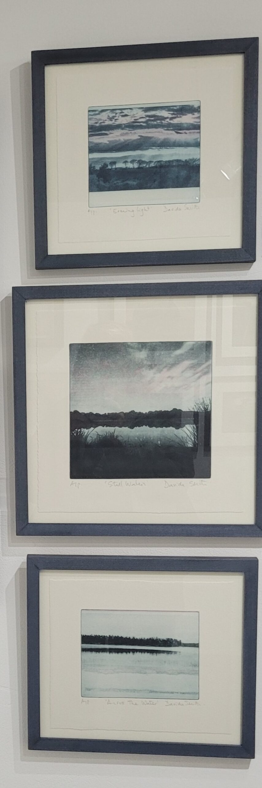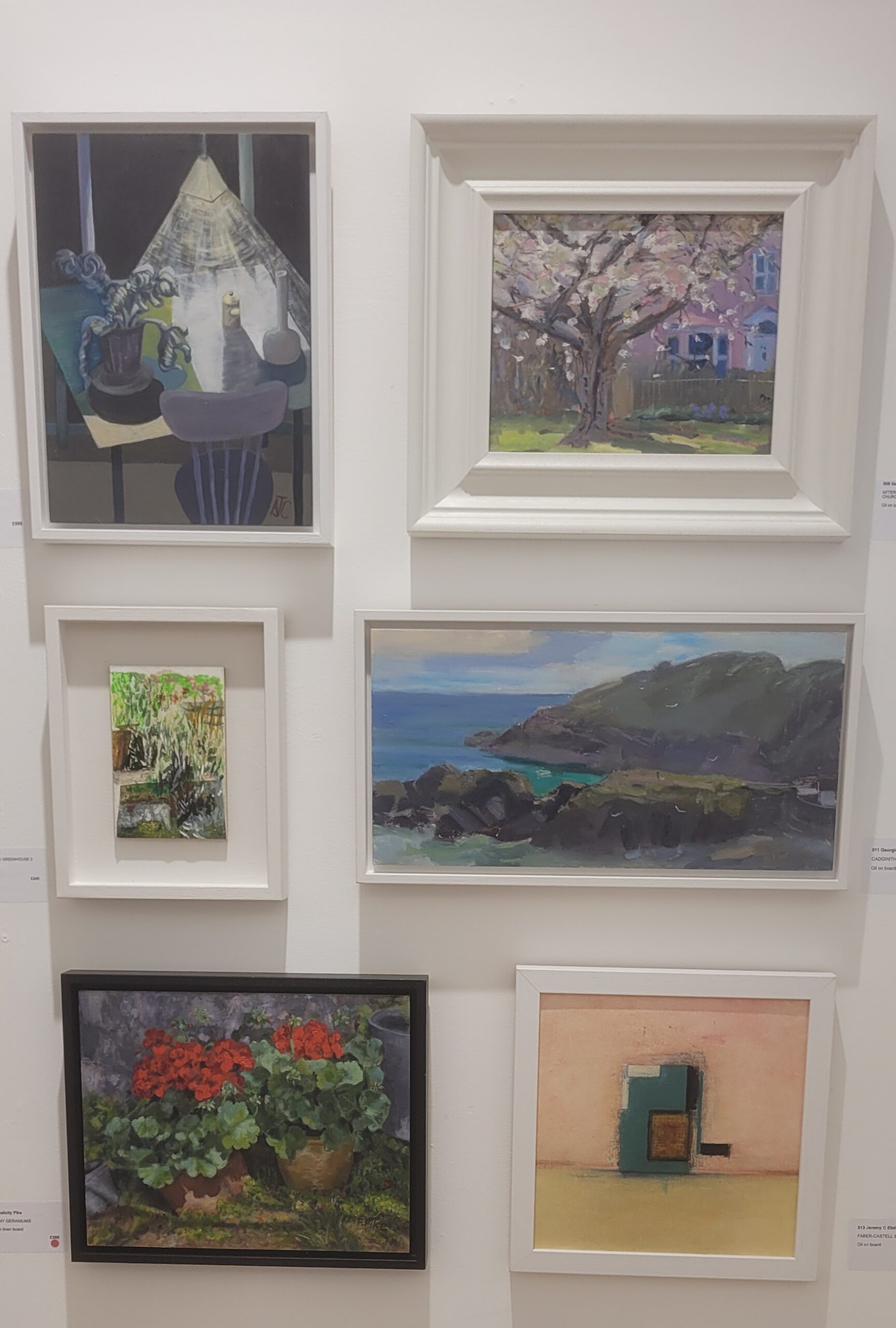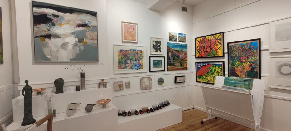 The vases of Lisa Katzenstein and delicate ceramic sculptures of Alison Proctor are grouped together and share the colour and vibrancy of nasturtium flowers and leaves. Davida Smith’s landscape prints, with their horizontal lines and blue tints, hang next to Jenny Pockley’s blue clouds and seascapes oils.