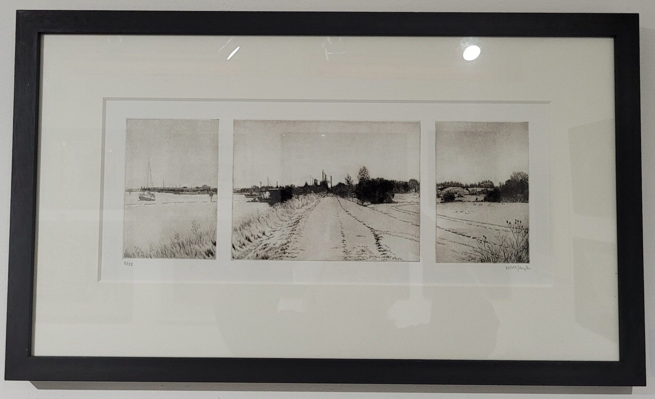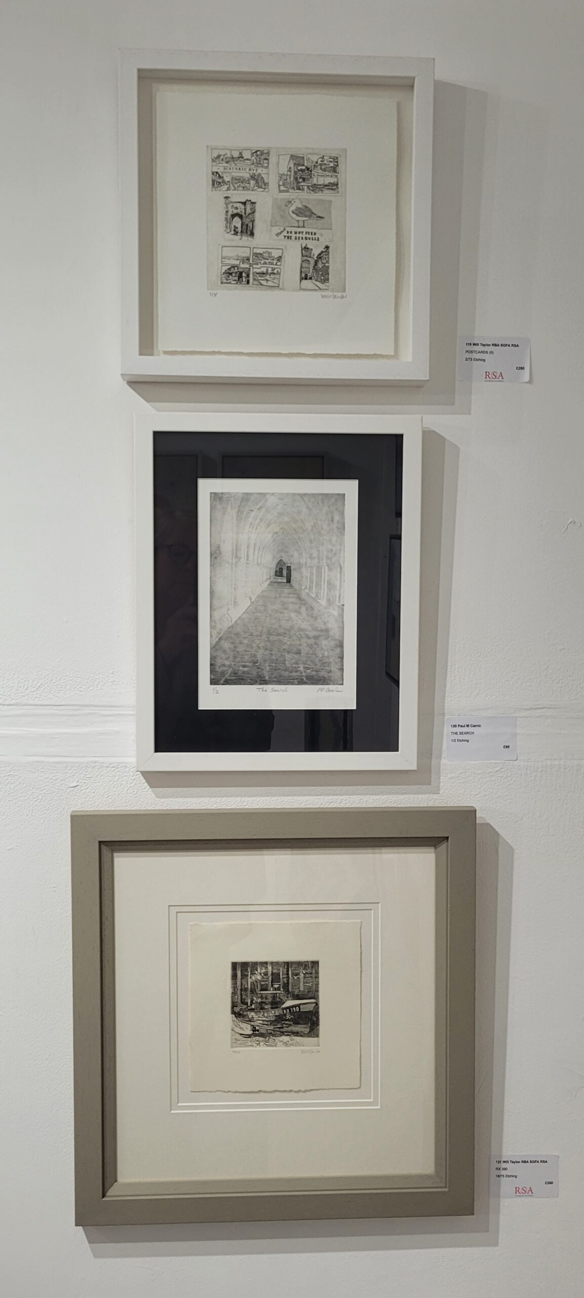 There are prints and drawings throughout the show – including etchings, linocuts, monoprints. RSA member, Will Taylor’s prints are delicately detailed and precise. His drypoint Rye Harbour triptych, with a panoramic view from Rye towards Rye Harbour is split into three sections – the Rother, distant chemical works and the field beside the river – the sense of place conveyed through dark silhouetted shapes, fine lines and empty space, reminiscent of Sir Frank Short’s etchings.