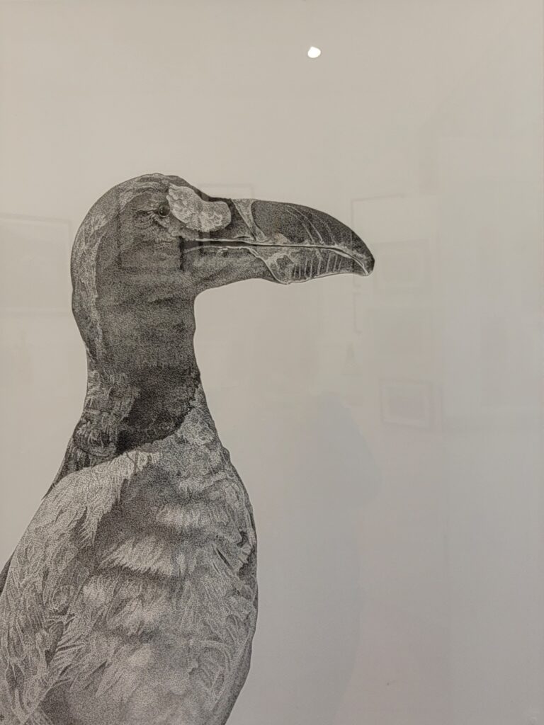 “He made no cry” (Great Auk) by Chris Booth, a technical tour de force, is a stippled drawing using fineliner pen of the now extinct great auk, portrayed with precision and delicacy which took the artist a total of 45 hours over 12 days.