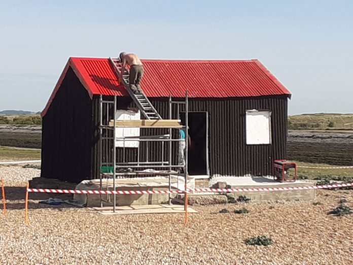 The Red Hut near the mouth of the River Rother on the Rye Harbour and nature reserve side has featured in many paintings and photographs over the years, and it is (as shown above) now being done up and becoming all ship shape and Bristol fashion with a cheery lick of paint on the iconic red tin roof – and they’re also renovating the concrete plinth the building sits on.
