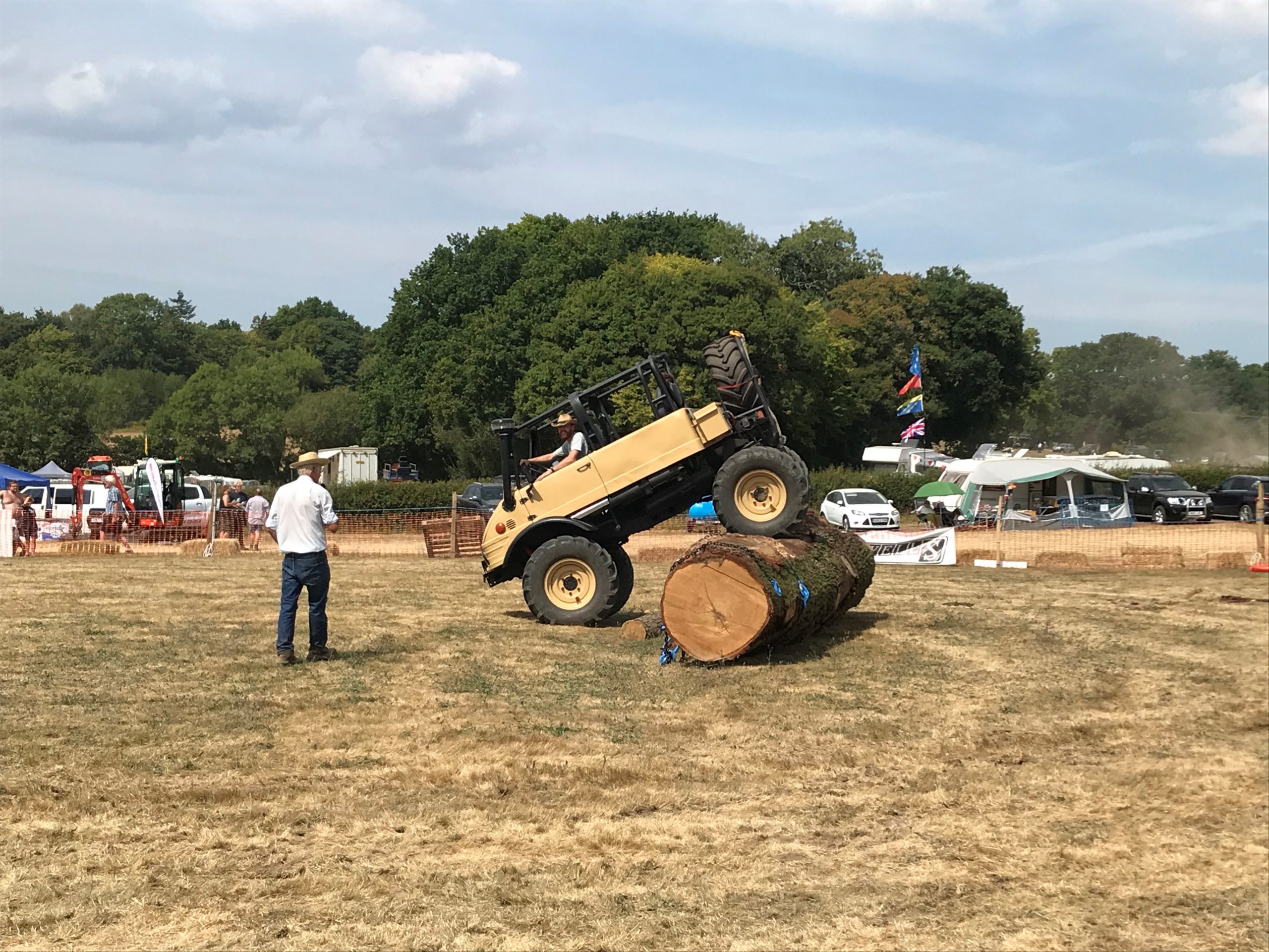 For the intrepid tree climbers there was the chance to climb a 40’ tree and to prove you had reached the top, the chance to ring a bell. Down on terra firma, a seven ton tree was dragged into the arena by a massive John Deer tractor supported by another John Deer with a forwarder and then a JCB and Manitou who showed us all how ‘easy’ it was to move and lift a seven ton tree with ease – well that’s how it looked. Later in the proceedings a Unimog entered the arena and calmly drove onto this massive tree then did the same in reverse, amazing spectacle to witness.
