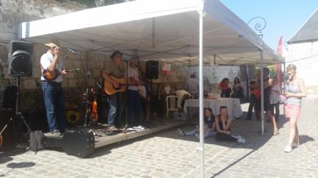 On Sunday morning we were up and about by 10 to catch the first concert of the day at 11am. I doubt if the band have ever played a gig at 11am on a Sunday, competing with church bells. It was a glorious sunny morning and we were soon tempted into tasting glasses of rosé wine. Johnny Cash and Rolling Stones songs echoed round the little square and Steve Stone sang his first rendition of his song Terraced House to which fans could sing along, but the words were mostly lost on the French locals. After an hour or so it was time to seek out a few bars and a cafe for lunch.