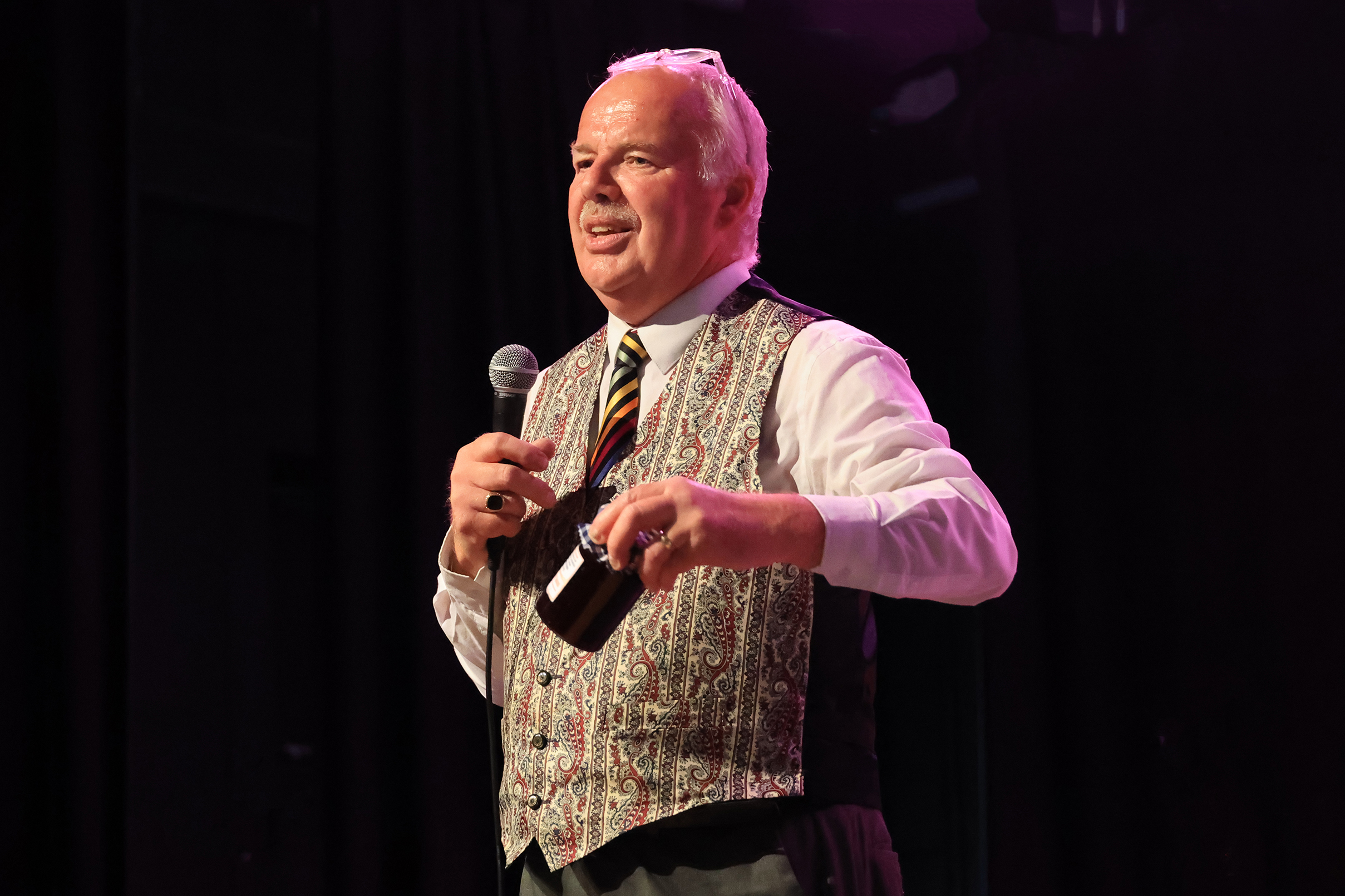 Our compere for the afternoon was the elegantly-waistcoated Richard Moore, ably assisted by his two grandchildren, curtain-pullers in-chief and raffle ticket drawers extraordinary. Richard established a friendly and relaxed atmosphere in which the audience could sit back and luxuriate both in the sounds of yesteryear – Coronation Scot, Duke Ellington Medley, Comedian’s Gallop; and in some classical favourites – Finlandia, Carmen and Rossini’s La Danza, for example.