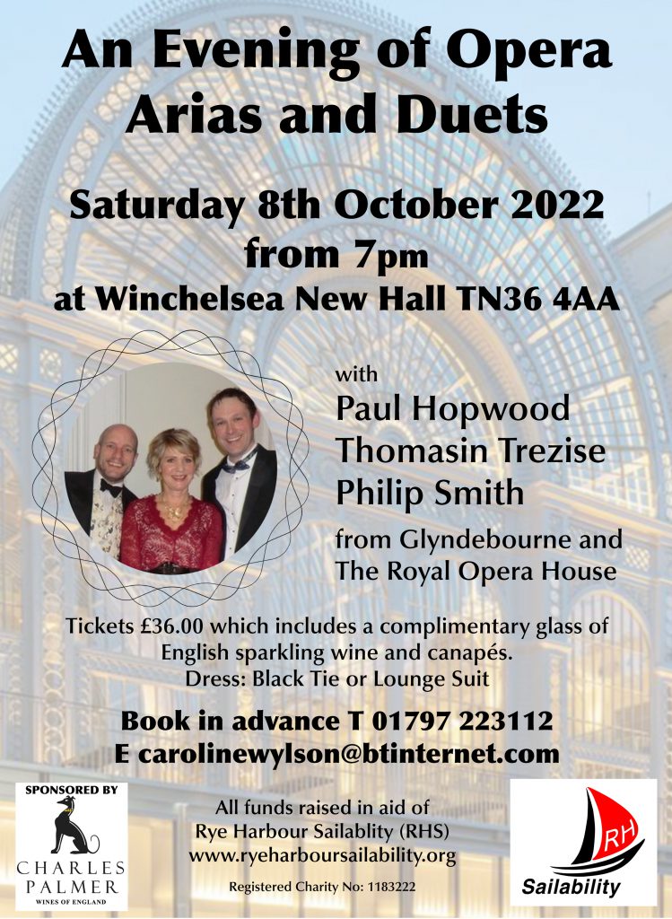 Rye Harbour Sailability are delighted to present Paul Hopwood, Thomasin Trezise and Philip Smith from Glyndebourne and the Royal Opera House. The programme on the night will include some of the world’s best-loved opera arias and duets.