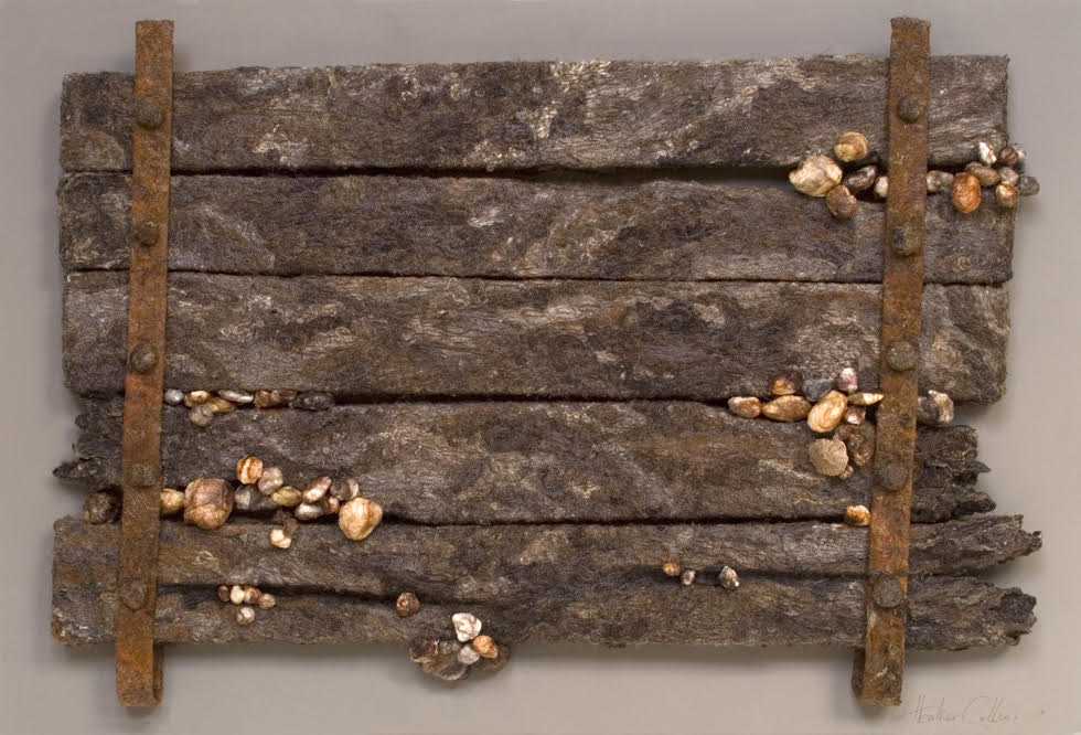 Each piece requires enormous commitment and some, such as her life-sized anchor or beach groynes, inspired by Rye Harbour Nature Reserve, take months to create. “I start with a few strands of thread or wool,” she explained. “I then stitch each of them together by hand or with a machine. I add more fibres and tiny pieces of cloth to create a large piece of hand made fabric. I’m not precious about my work, I’ll chop it up numerous times and distress it with a soldering iron to achieve the desired texture and colour.” Once she has a large enough piece of base fabric she stretches it over a mixed media frame of chicken wire, wrapped in muslin and dipped in a weak solution of PVA glue. The final work is shaped and embellished with beading, knot work and hand stitching.