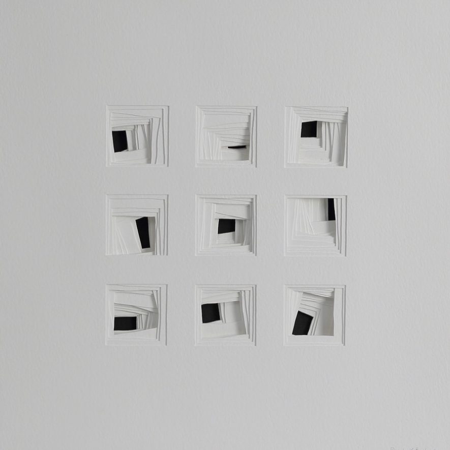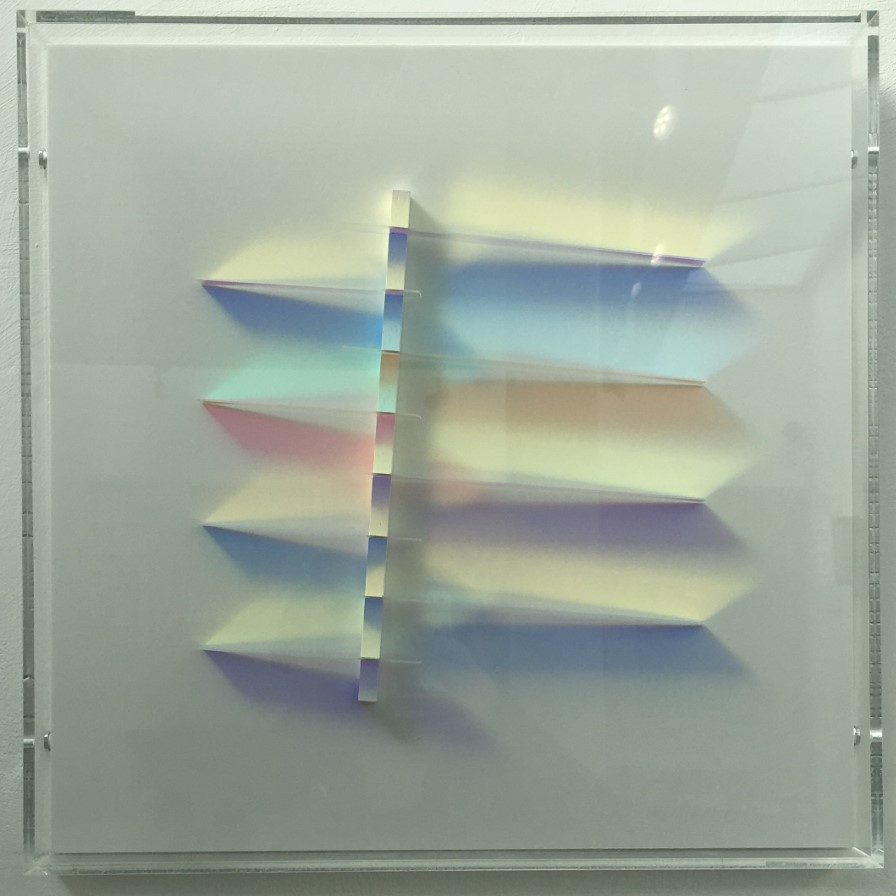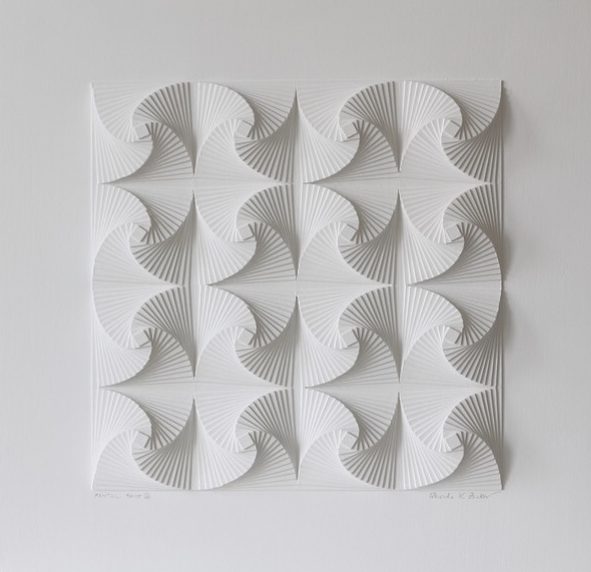 Has a background in textile design and weaving. This shows but the elements that make her works are more than that. They are mainly white, cut and contoured pieces with dramatic patterns also with geometry. There is a huge amount of light, space and ethereal qualities in the shapes that are sometimes repeated, sometimes stand alone like looking into the distance. Once again into a far away land.