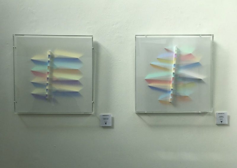 Hildegard says that these works are influenced and inspired by architectural space on a smaller scale and one can see the connection with geometrical shapes intertwined with the light and references to nature that spring out to one.The subtle and soft colours are opaque with such a softness that it makes one feel that one is in a far away land.