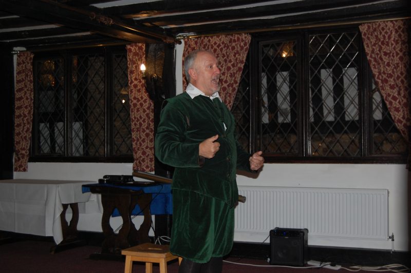 Then in the second half on came Will, the man himself dressed in Tudor garb, giving his life story boisterously, gaining audience participation. He portrayed the stage-struck lad, the meetings with touring actors and the opportunity to learn his craft during those “lost years” from his leaving school aged 15 to the first dated play (Henry IV Part I) in 1592.