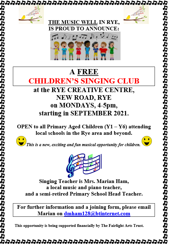 The singing club will take place at the Rye Creative Arts Centre, on Mondays from 4pm – 5pm, and is being offered free to all children for at least one year. The Children’s Singing Club is being fully funded by the Fairlight Arts Trust. There is free parking on-site and a café (which is open now!)