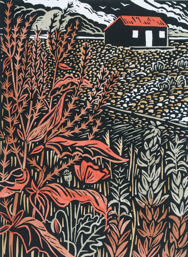 Top hut: one of the most popular of Soudain’s hand-coloured linoprints was Rye Harbour, an old, red-roofed, familiar landmark beside the river Rother at Rye Harbour
