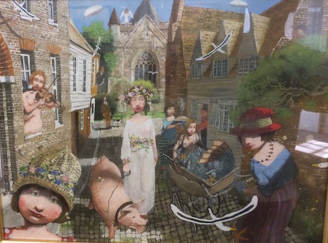 Titles can be misleading as Richard Adams’ chalk pastel above entitled Normal for Rye has a pig being herded along West Street towards Lamb House while a violin playing nude leans out from a window. Readers familiar with EF Benson’s Mapp and Lucia novels and the recent “Mapp” BBC TV series may think it accurately reflects life in Rye, but residents in the historic citadel – topped by St Mary’s Church, seen in the painting’s background – may disagree.