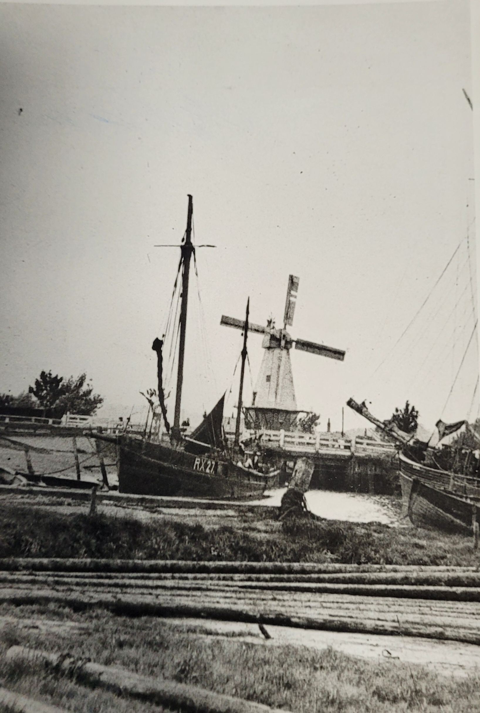 In the background is the Tillingham bridge over the river with the windmill and gasworks which had been producing coal gas since the 1830s. The crane on the quay was used to set masts into boats and to load and unload. On the left bank is a the shipbuilding yard of Hoads who built sailing and steam fishing and trading boats.