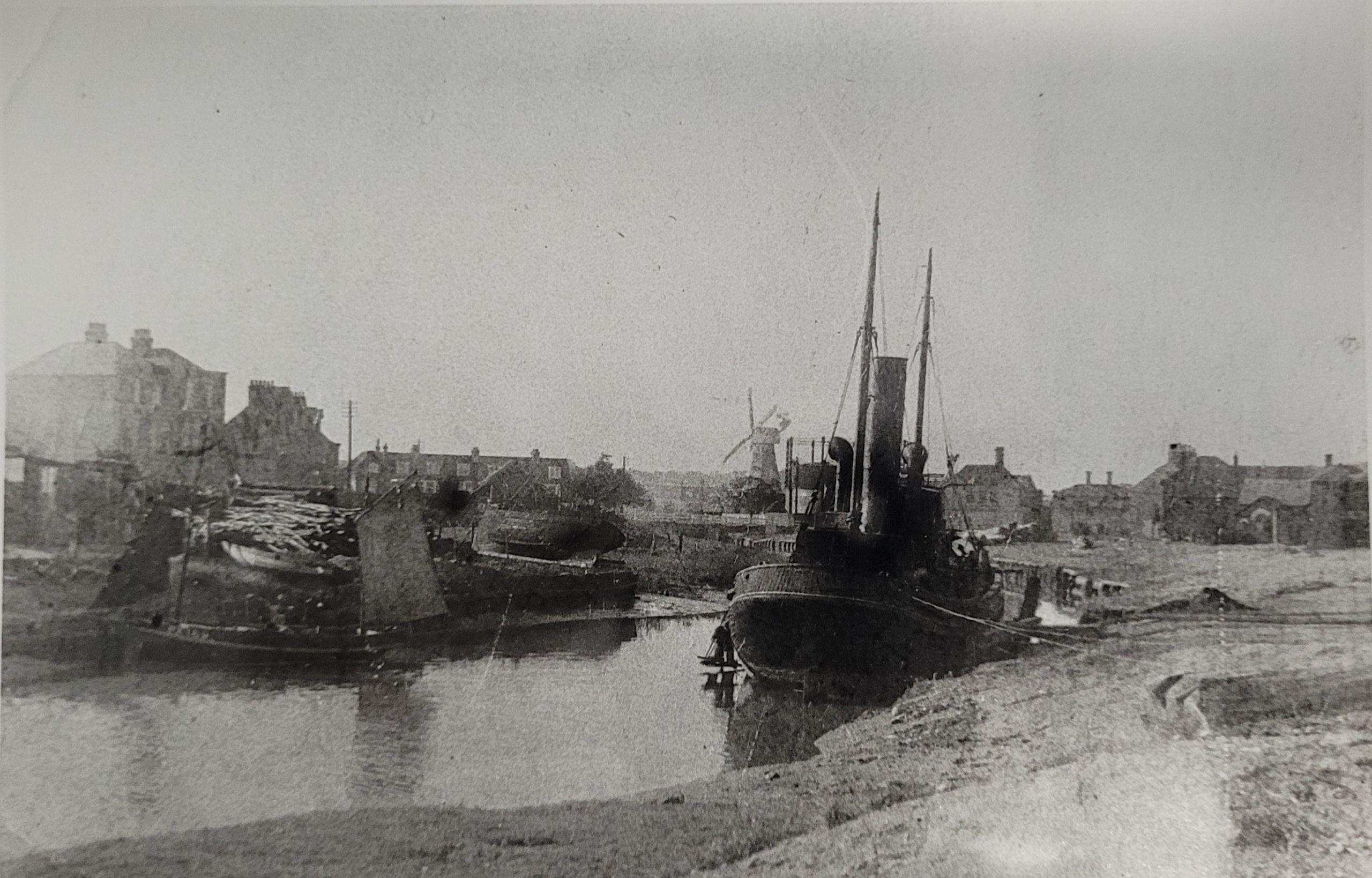 The Mountsfield, a ketch coaster built in 1910 by G & T Smith moored near the Tillingham bridge. In the background, behind the ship, Thomas Hinds and Sons timber yard can be seen on the right and next to it, the striped building, is the Rye Customs House built in 1855 which then became the coal office in the mid 1920s.