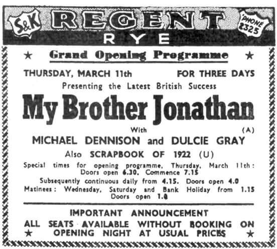 By the late ’40s the Regent had been rebuilt with 744 seats and entered its second phase from Thursday March 11, 1948. However, this coincided with a general downturn in cinema going. Initially, the post war baby boom kept parents at home, but then the introduction of BBC television in London from 1948 and later ITV from 1955 led to a rapid decline in attendances. Southern Television from Southampton, housed in an old cinema, began transmissions on 30 August 1958, and two years later a new powerful TV mast at Dover increased coverage to East Sussex and Kent.
