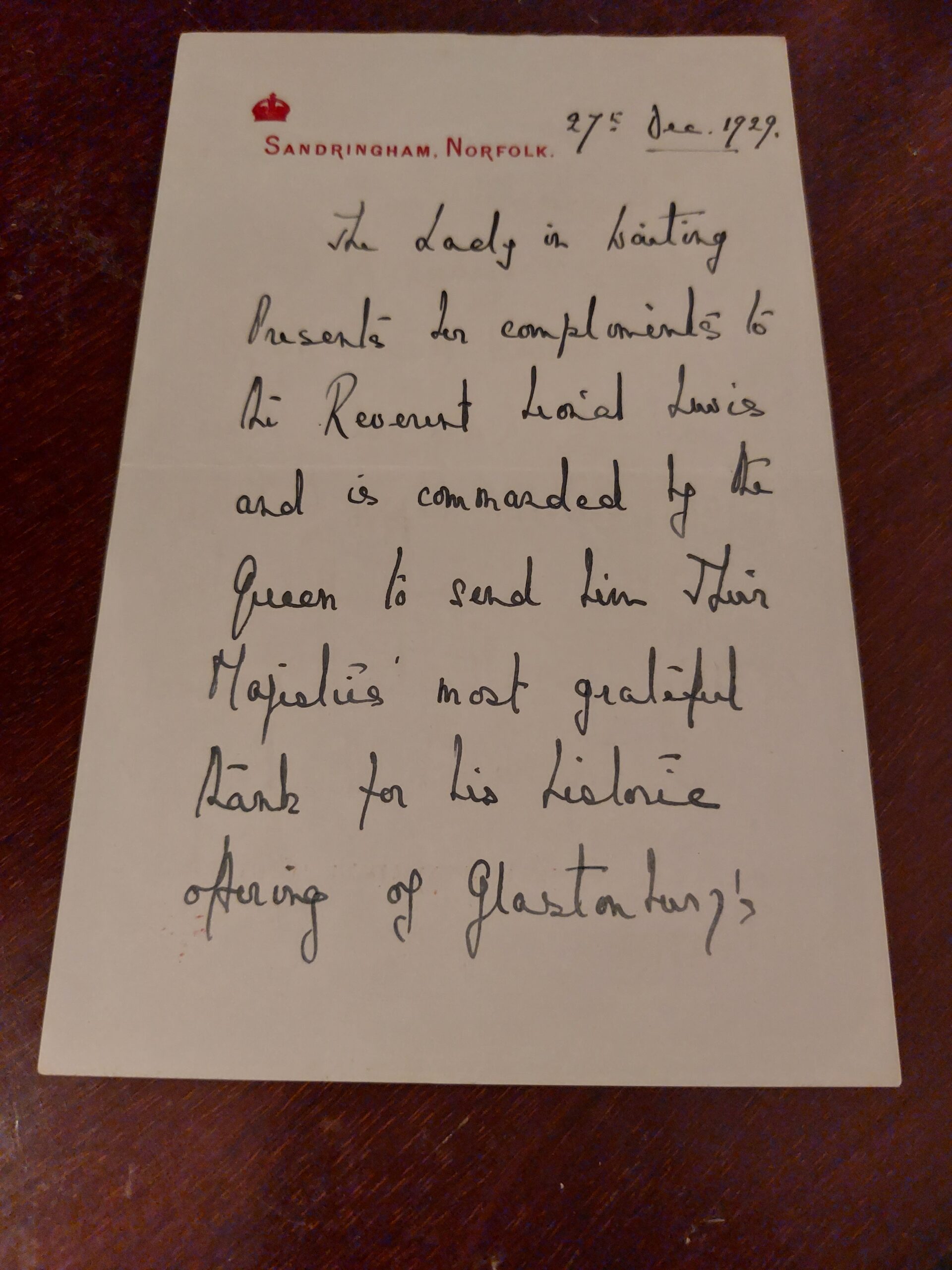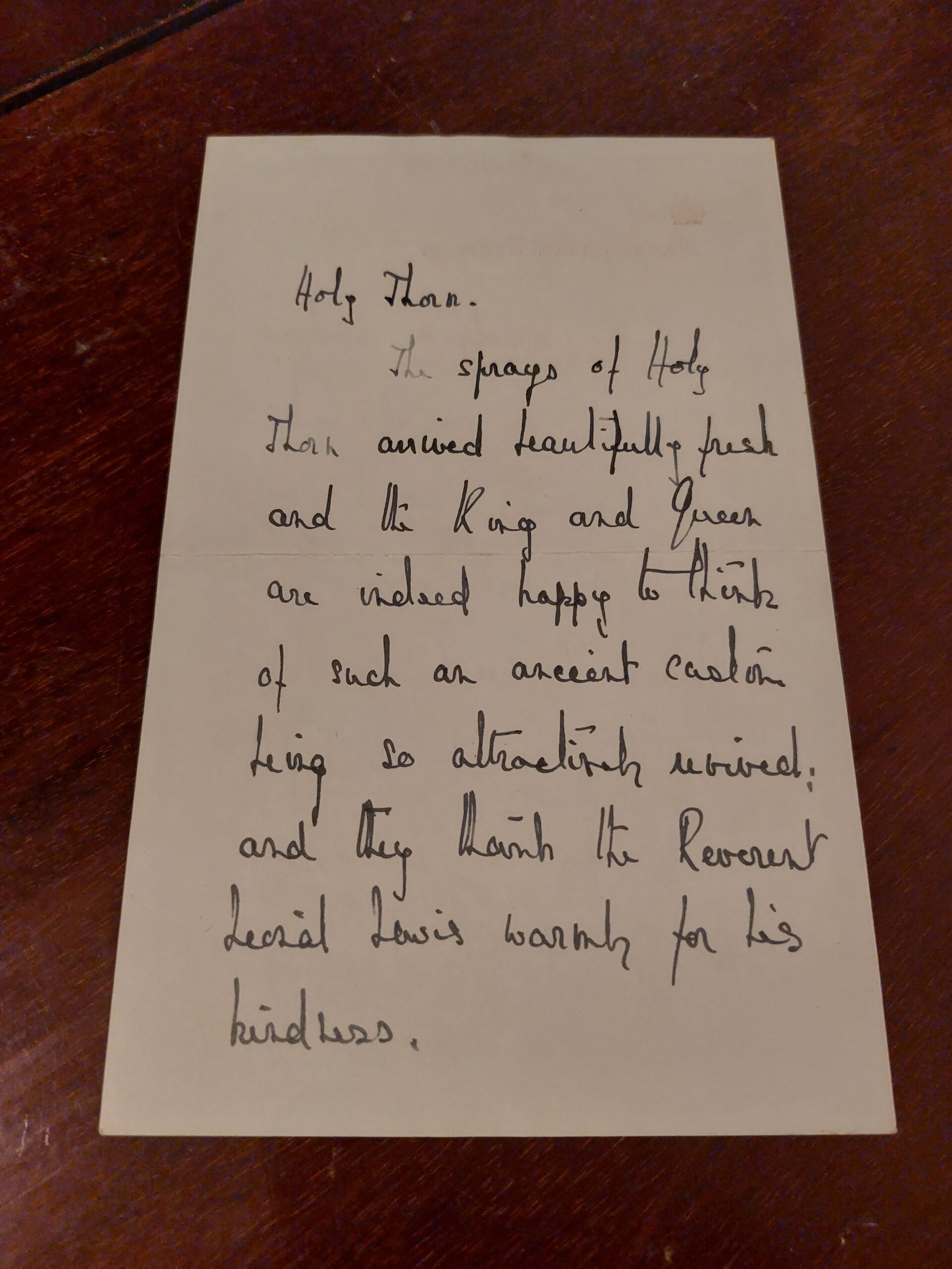 Footnote: It might be interesting to note that the letter from Sandringham saying that the king and queen would accept the thorn was sent on 23rd December 1929 and the letter of thanks for it on 27th December. Could that speed of dispatch and delivery be achieved over the Christmas period nearly 100 years later? Progress anyone?