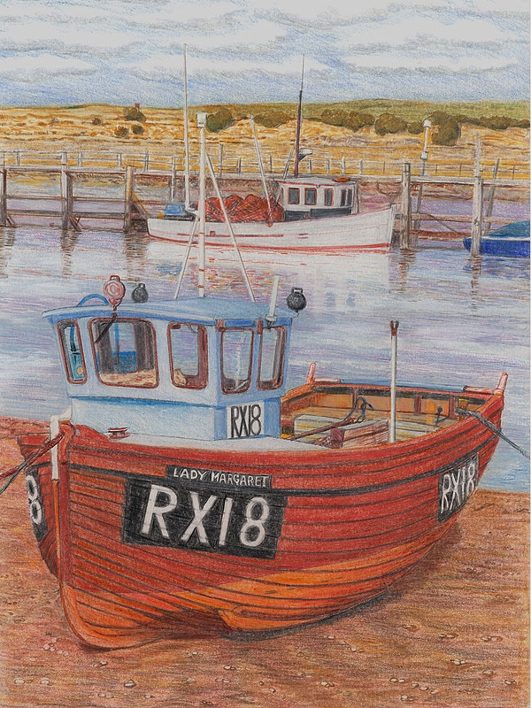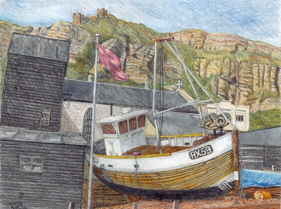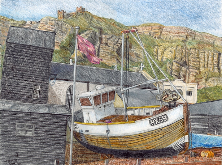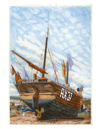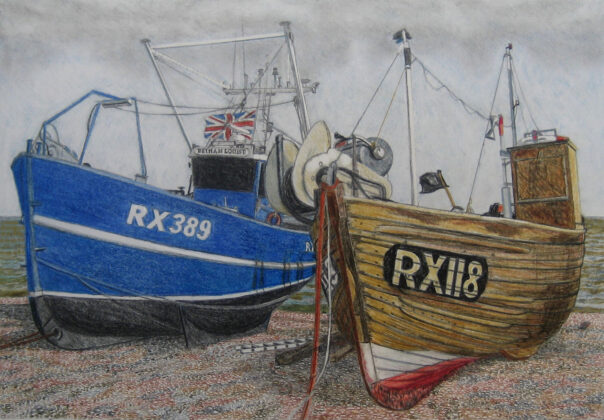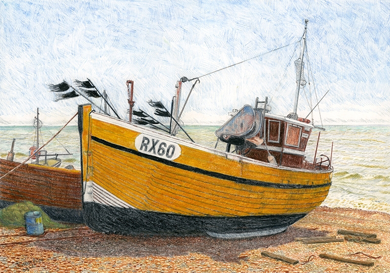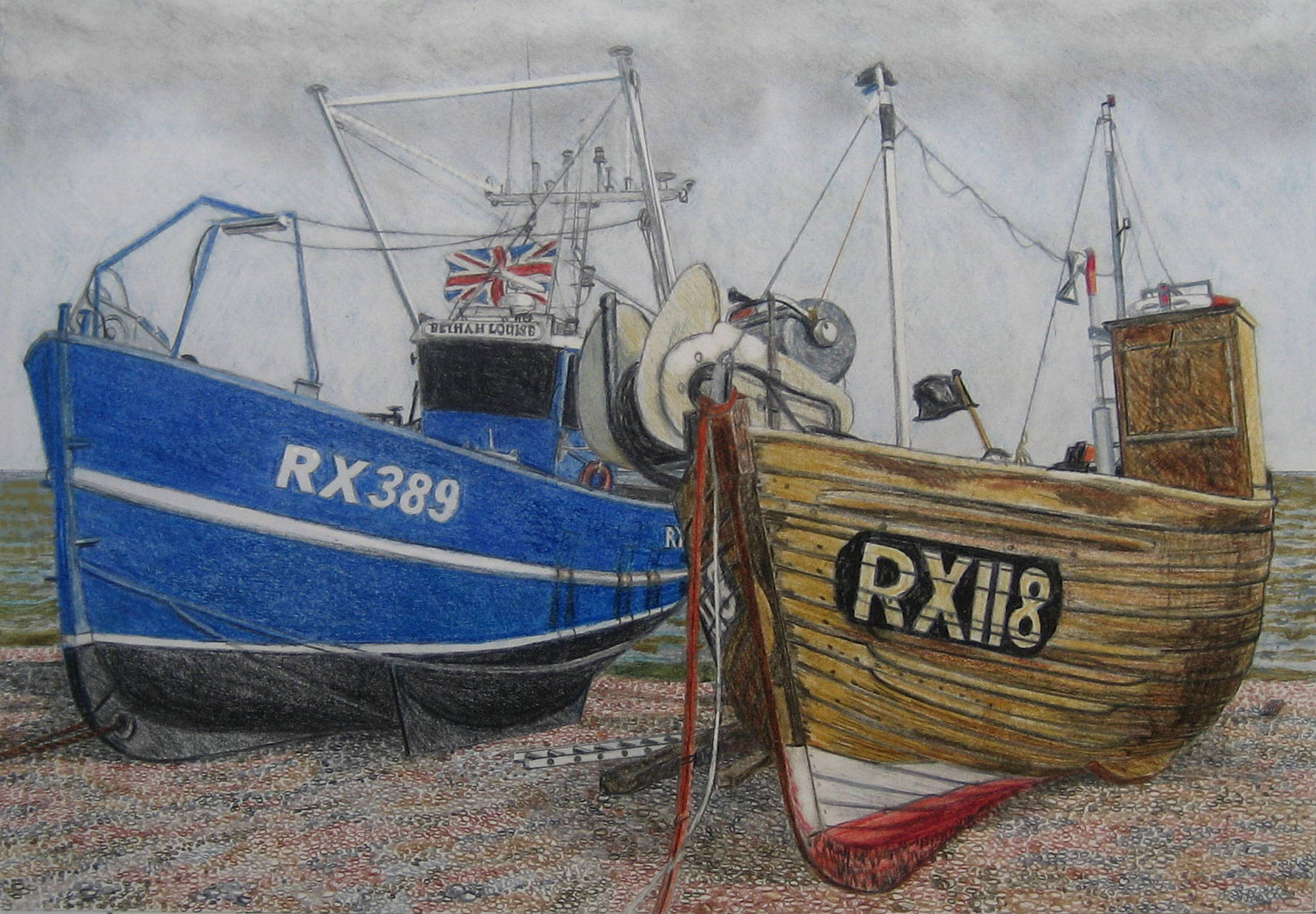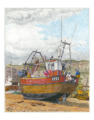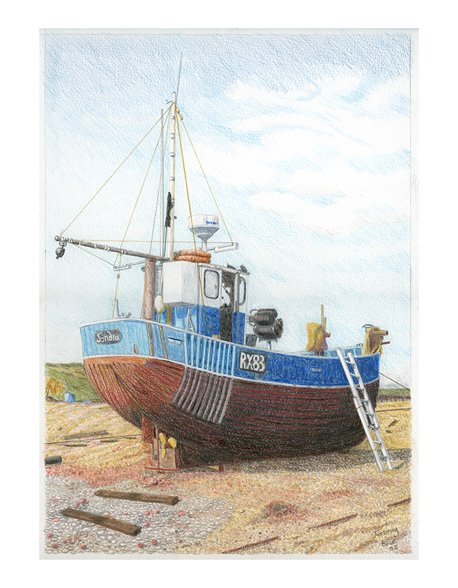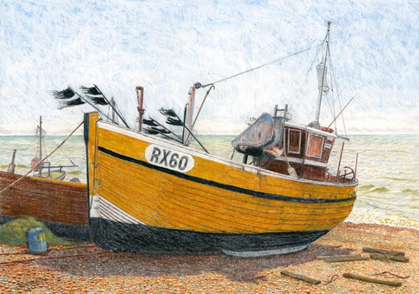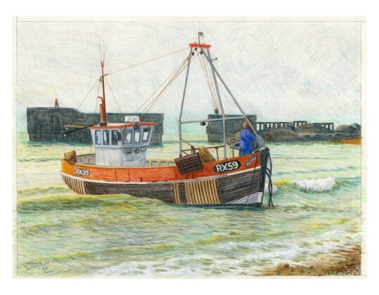 The artist, Jeremy Bear, came across RX18 when visiting Rye Harbour and drew the picture of her, seen in the featured image above. He has a passion for the sea and working boats and makes drawings and paintings of boats from around the country and in India. “My long-term project is to observe and portray the wooden fishing boats that are launched from the shingle beach in Hastings. This now forms a series of more than twelve drawings.”