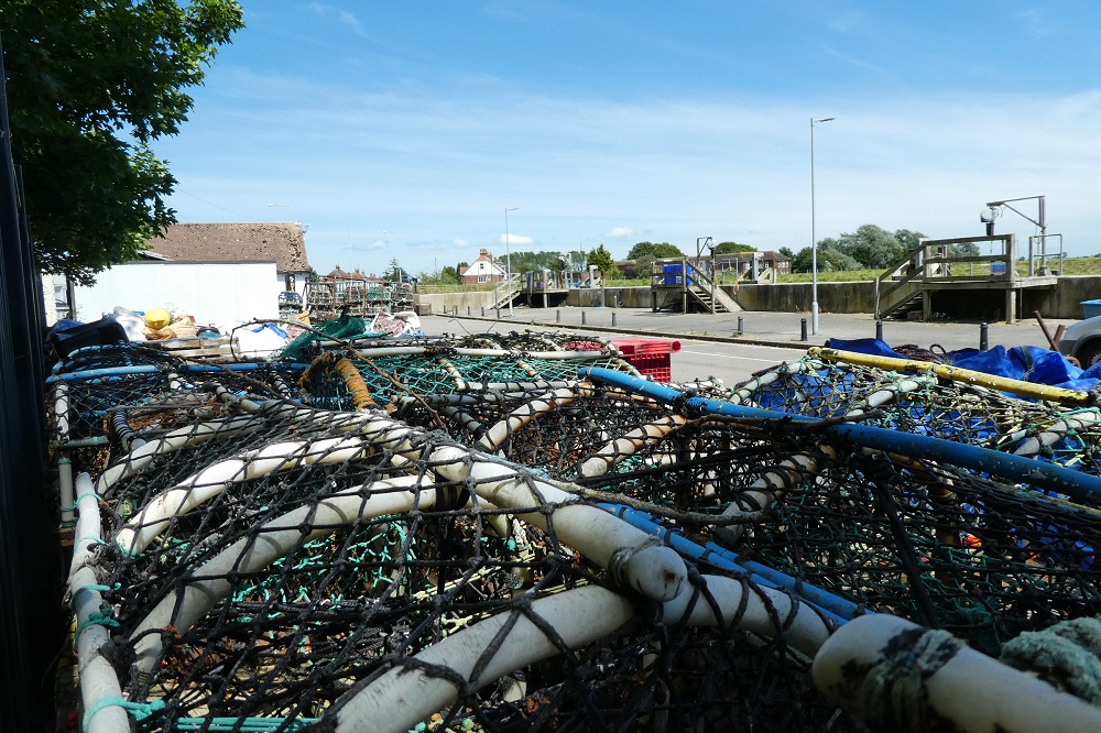 Our circular tour now takes us around the perimeter of the town close to the river banks. Crossing the Salts, the fishing quay visible through the metal fence was upgraded and modernised in the 1980s. Just visible in the photograph is the Monkbretton Bridge which dates from 1893, before which any road transport to New Romney was via Scots Float two miles to the north of Rye.