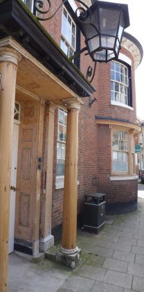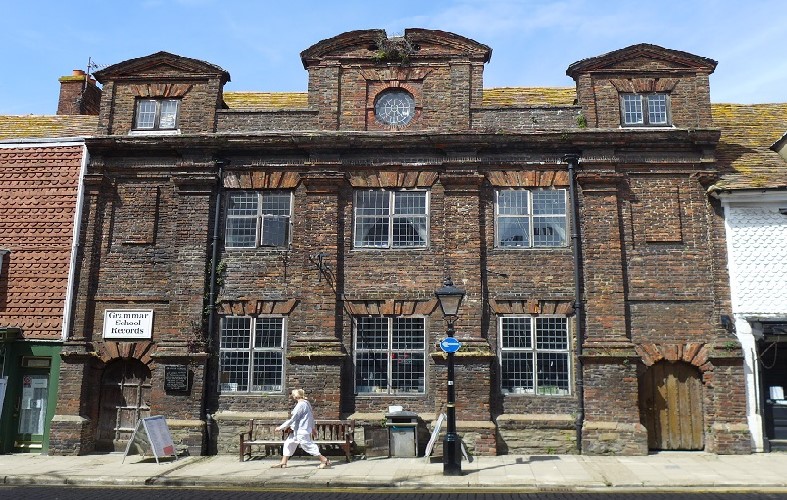In a prominent position opposite Lion Street looking up to the church tower is Grammar School Records. This very fine early decorative brick façade was built in 1736 by Thomas Peacock, a Rye councillor who established it as the town’s grammar school. It was in use until the present Rye College site was developed in 1908 and was converted from meeting rooms to the present shop and flats over in the 1980s (featured photograph)