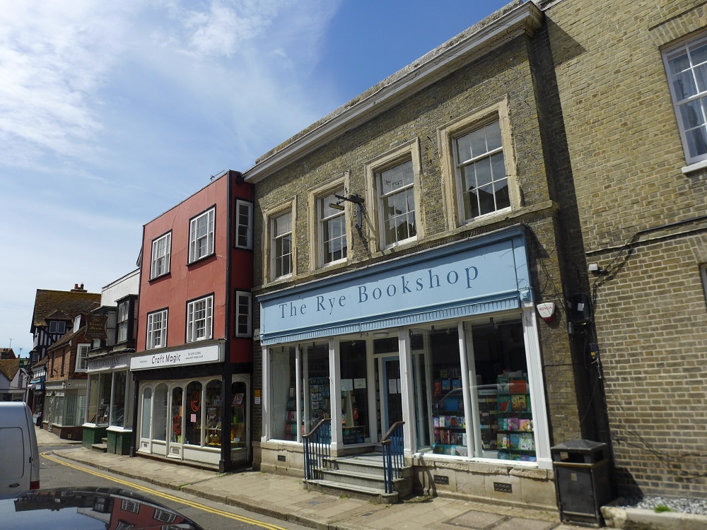 Two other long established businesses only changed in recent years; the Rye Bookshop was formerly occupied by Boots the Chemist, one of the later of the multiple retailers to move into Rye (in 1934), the yellow brick building was Sladen House earlier belonging to Kingsnorth Reeve, an auctioneer. To the left, the red building is Craft Magic. It was a very long established bookseller and stationers from the 18th century, taken over in 1929 by the Goulden family, and for many years the Martello Bookshop